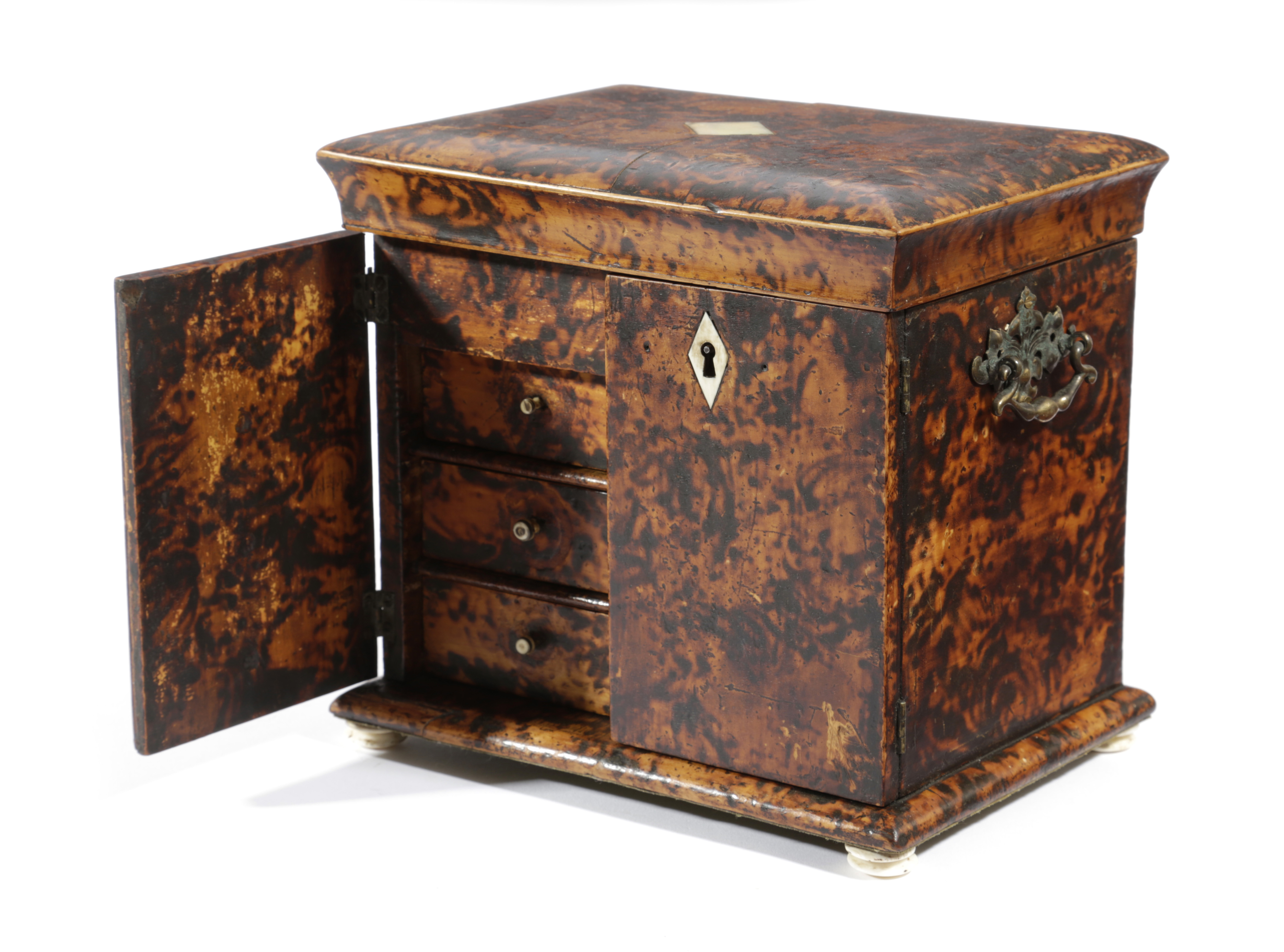 with a hinged cover above a pair of doors enclosing three drawers, with pyrograph decoration, ivory escutcheons, handles and bun feet