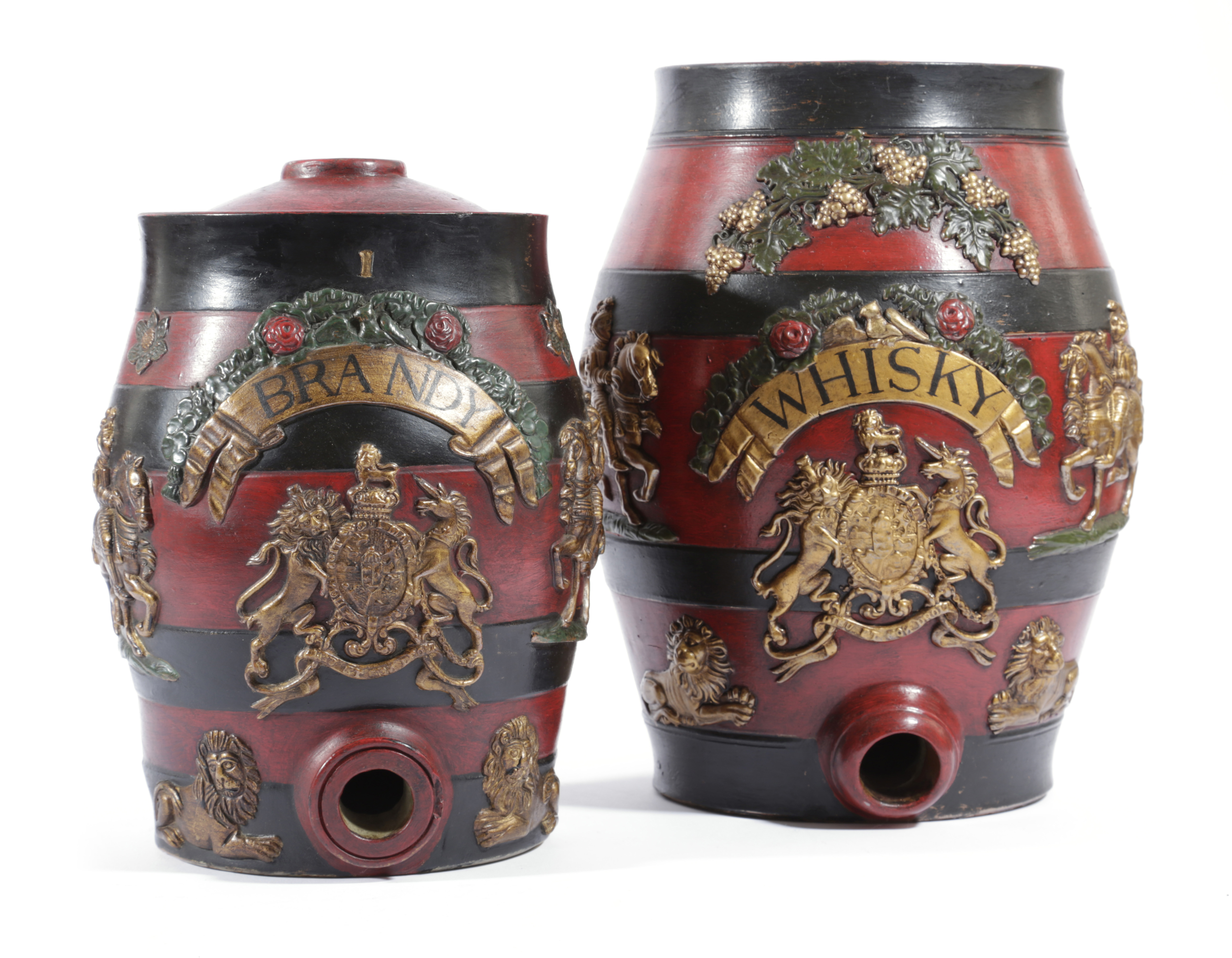 inscribed 'WHISKY' above the Royal Coat of Arms, flanked by knights on horseback and recumbent lions, on a red and black banded ground, together with a matching brandy barrel (2)