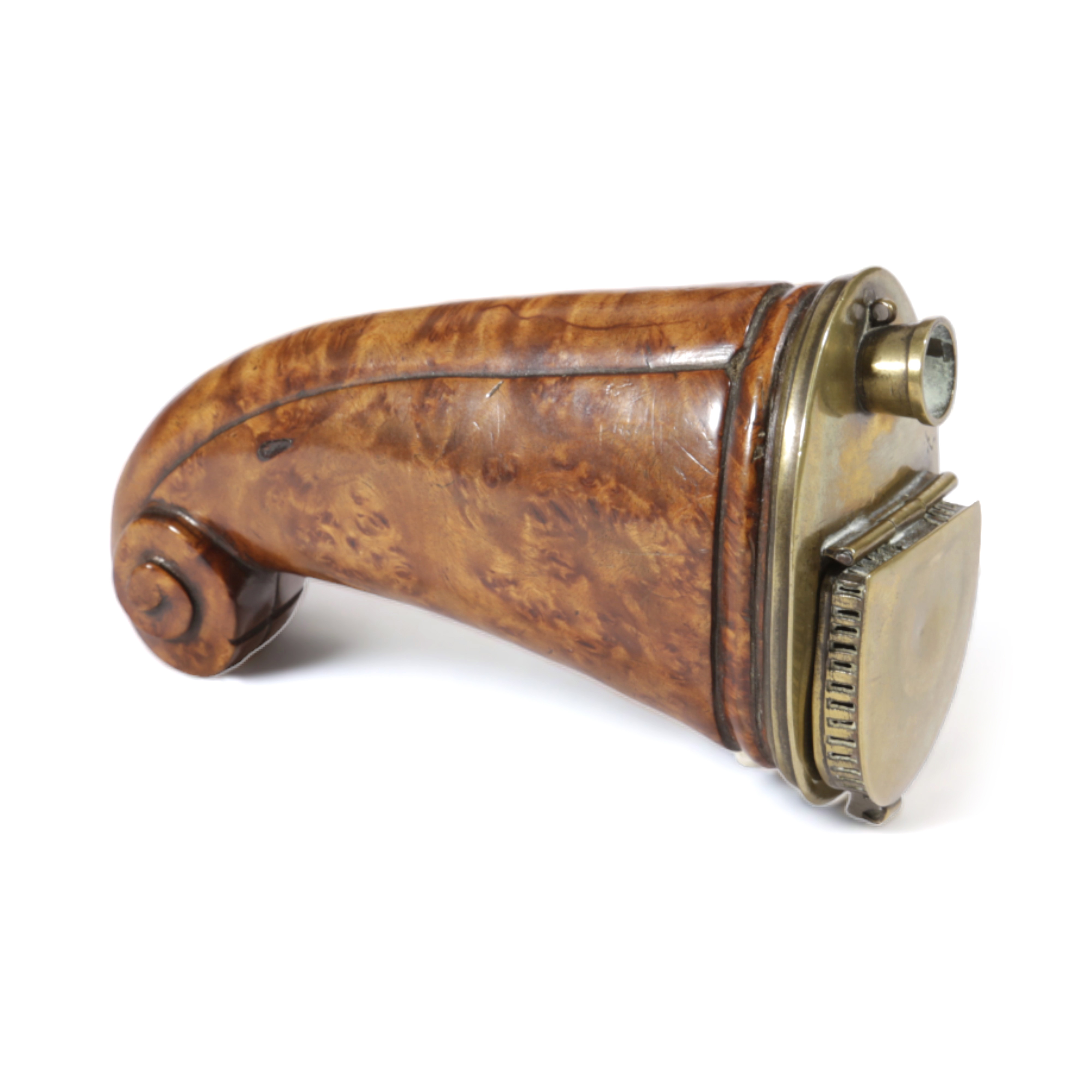 A TREEN BURR MAPLE AND BRASS PIPE BOWL