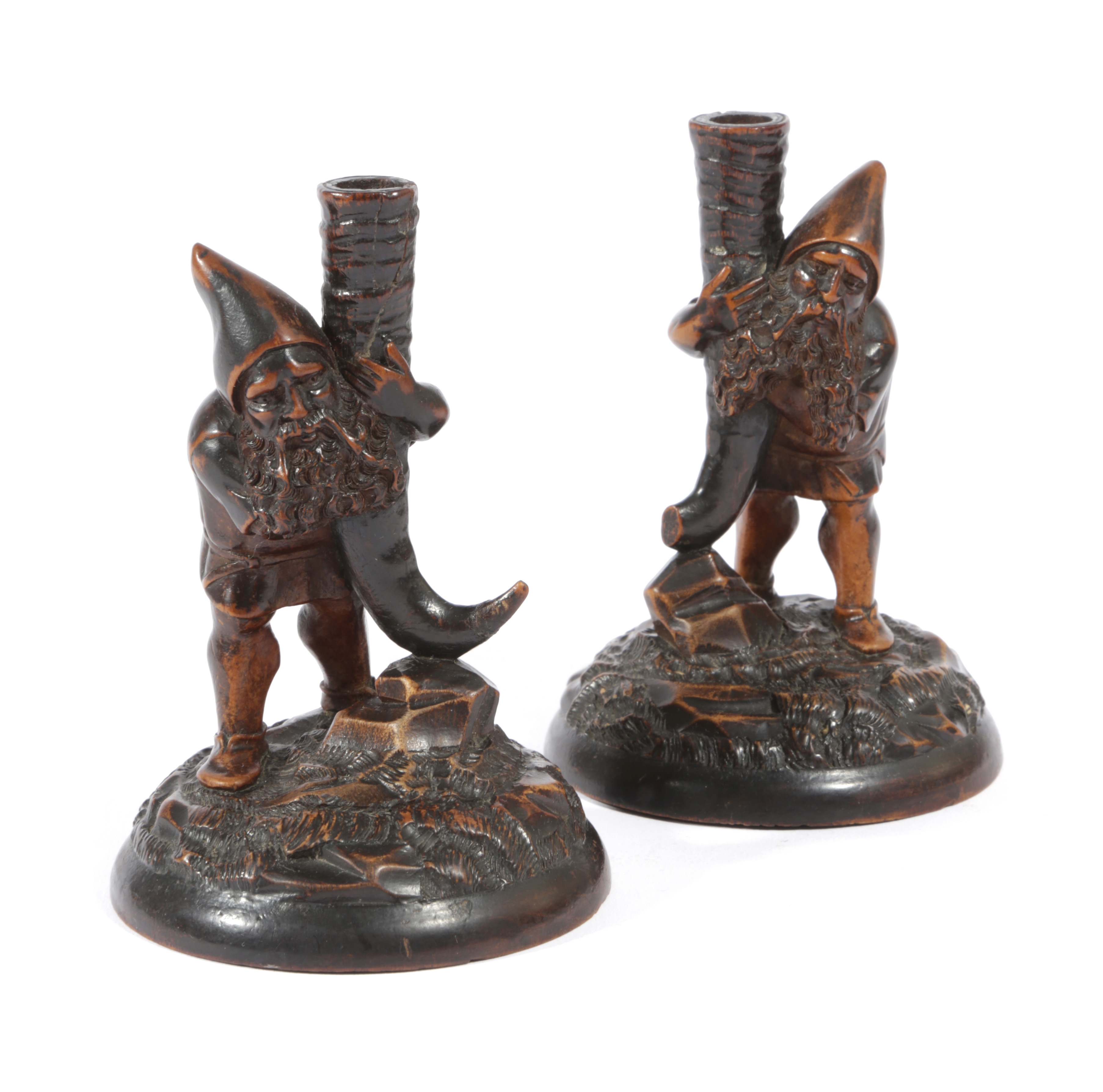 A PAIR OF TREEN GNOME SPILL HOLDERS