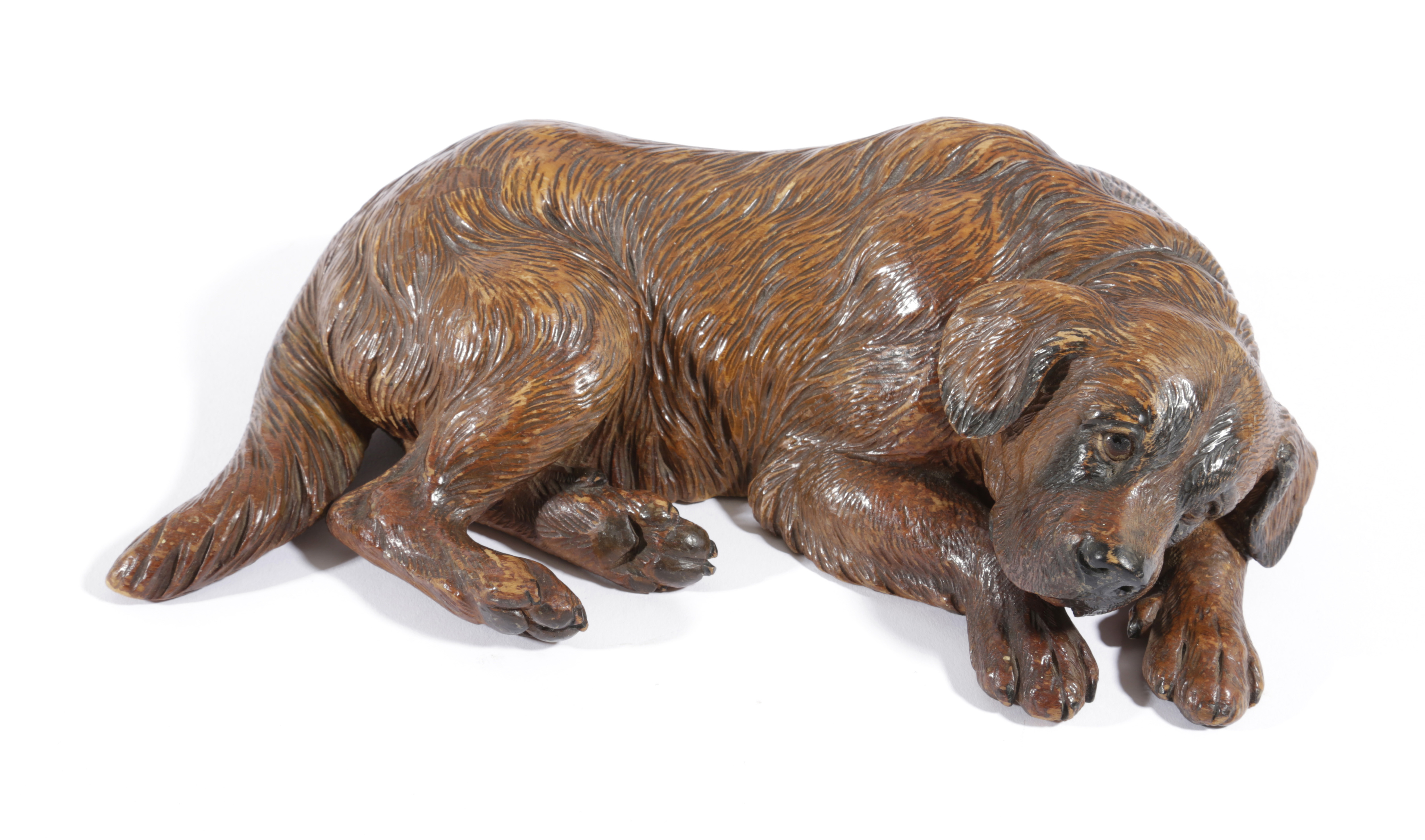 A BLACK FOREST LINDEN WOOD RECUMBENT MOUNTAIN DOG
