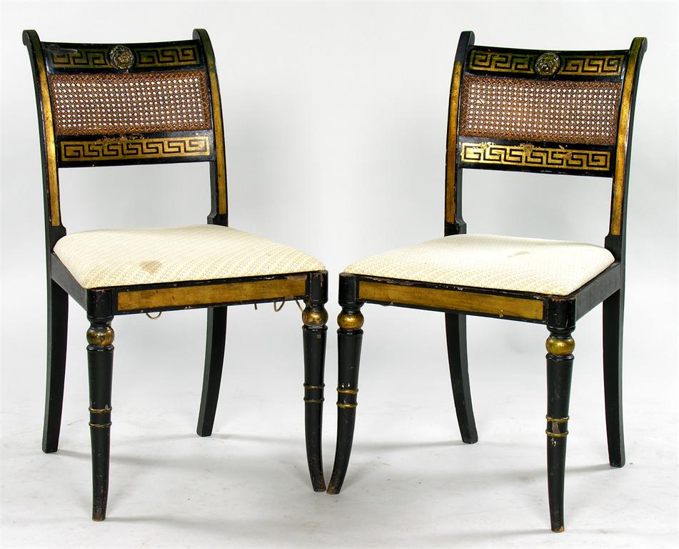 A set of 19th century painted side chairs, the open caned backs with Greek key borders and applied lion masks, the caned seats with later cushions, on turned splay legs. (6)