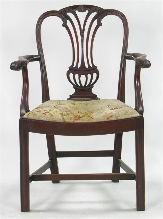 A 19th century mahogany open armchair, the pierced vase splat back with carved leafage decoration, the scroll arms with carved leaf terminals, the drop in dished seat on square moulded chamfered legs united by an 'H' stretcher.