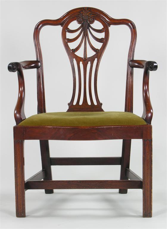 A Hepplewhite style mahogany open armchair, the moulded shaped back with a pierced vase shape splat with palmette and florets, the serpentine front drop-in seat on moulded square chamfered legs united by a 'H' stretcher.