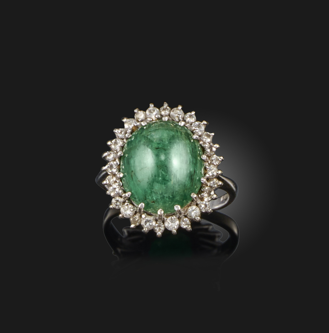 An emerald and diamond ring, circa 1978, of cluster design, set with a cabochon emerald weighing
