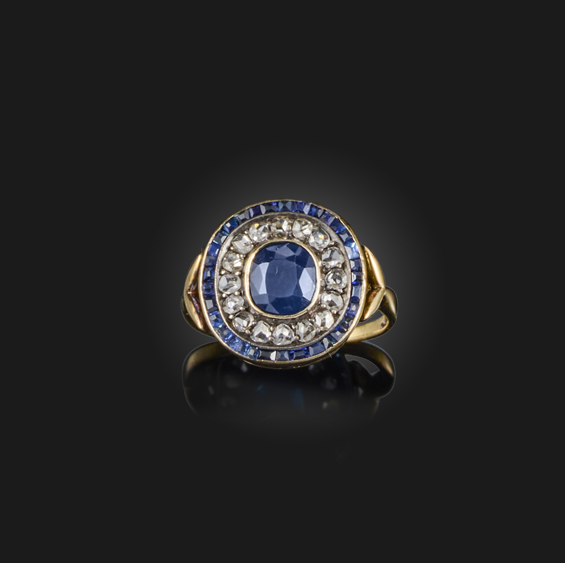 A sapphire and diamond ring, of target design, centring on a cushion-shaped sapphire, within concentric borders of rose-cut diamonds and channel-set calibré-cut sapphires, mounted in gold, size P, stamped 750