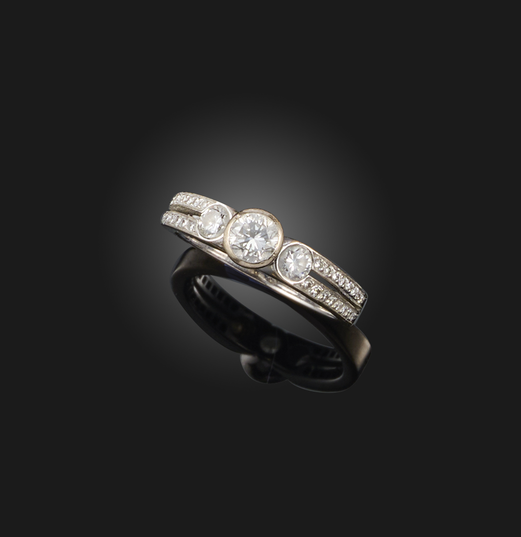 A diamond ring, centring on a collet-set brilliant-cut diamond weighing approximately 0.35 carats,