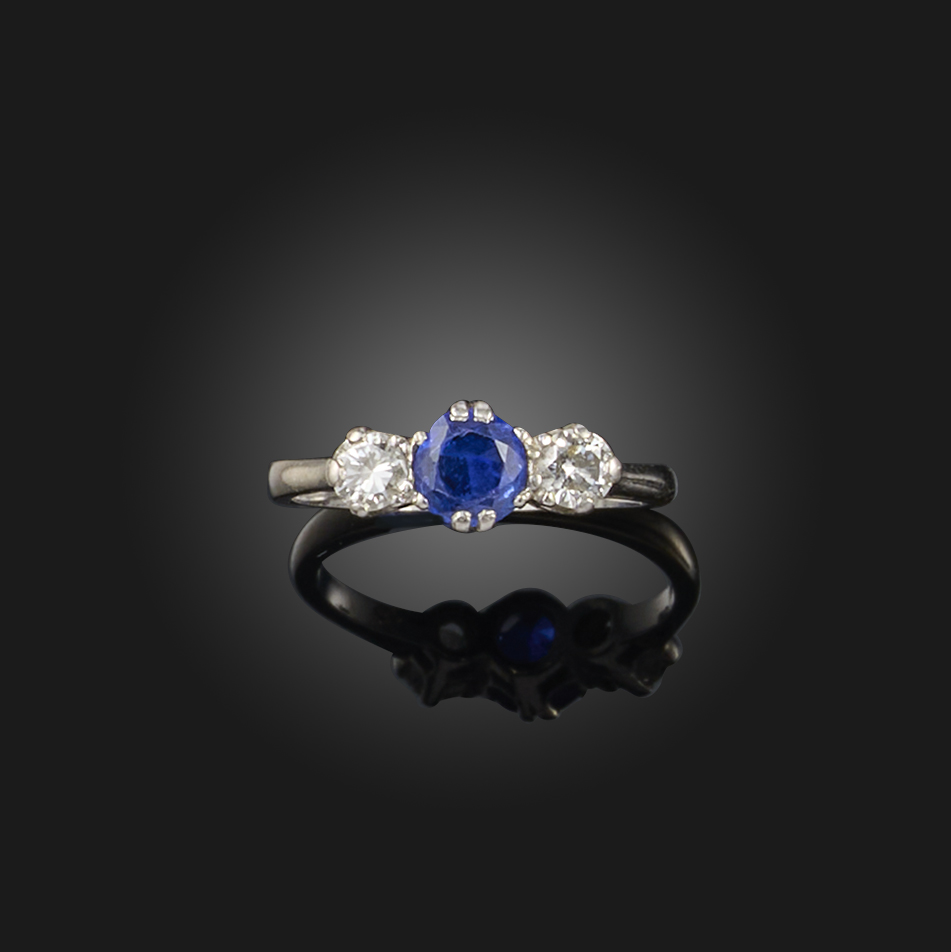 A sapphire and diamond ring, mid 20th century, claw-set with a circular-cut sapphire between brilliant-cut diamonds, mounted in platinum, size L, stamped PLAT