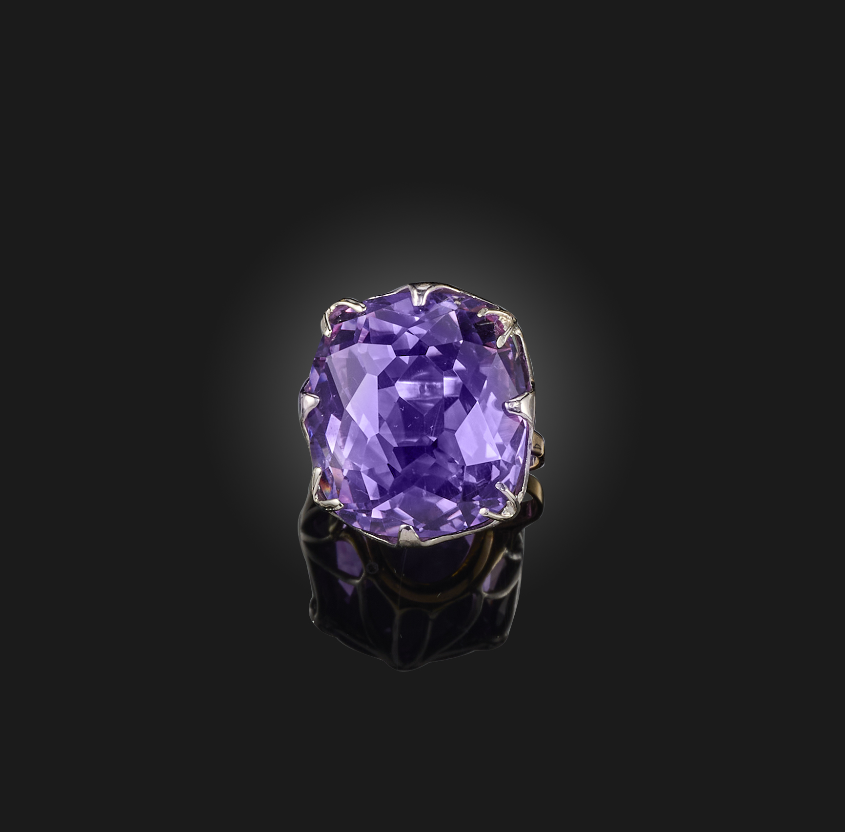 An amethyst solitaire ring, the large cushion-shaped amethyst claw-set in platinum and gold, size N
