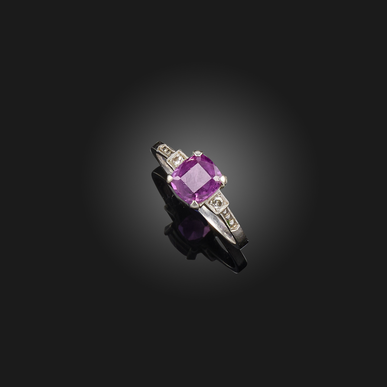 A pink sapphire and diamond ring, claw-set with a pink sapphire weighing approximately 1.10 carats, between single-cut diamonds, to a platinum band with faceted shoulders, size O1/2