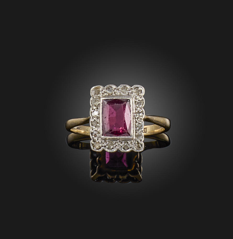 A ruby and diamond cluster ring, the step-cut ruby set within a surround of rose-cut diamonds in