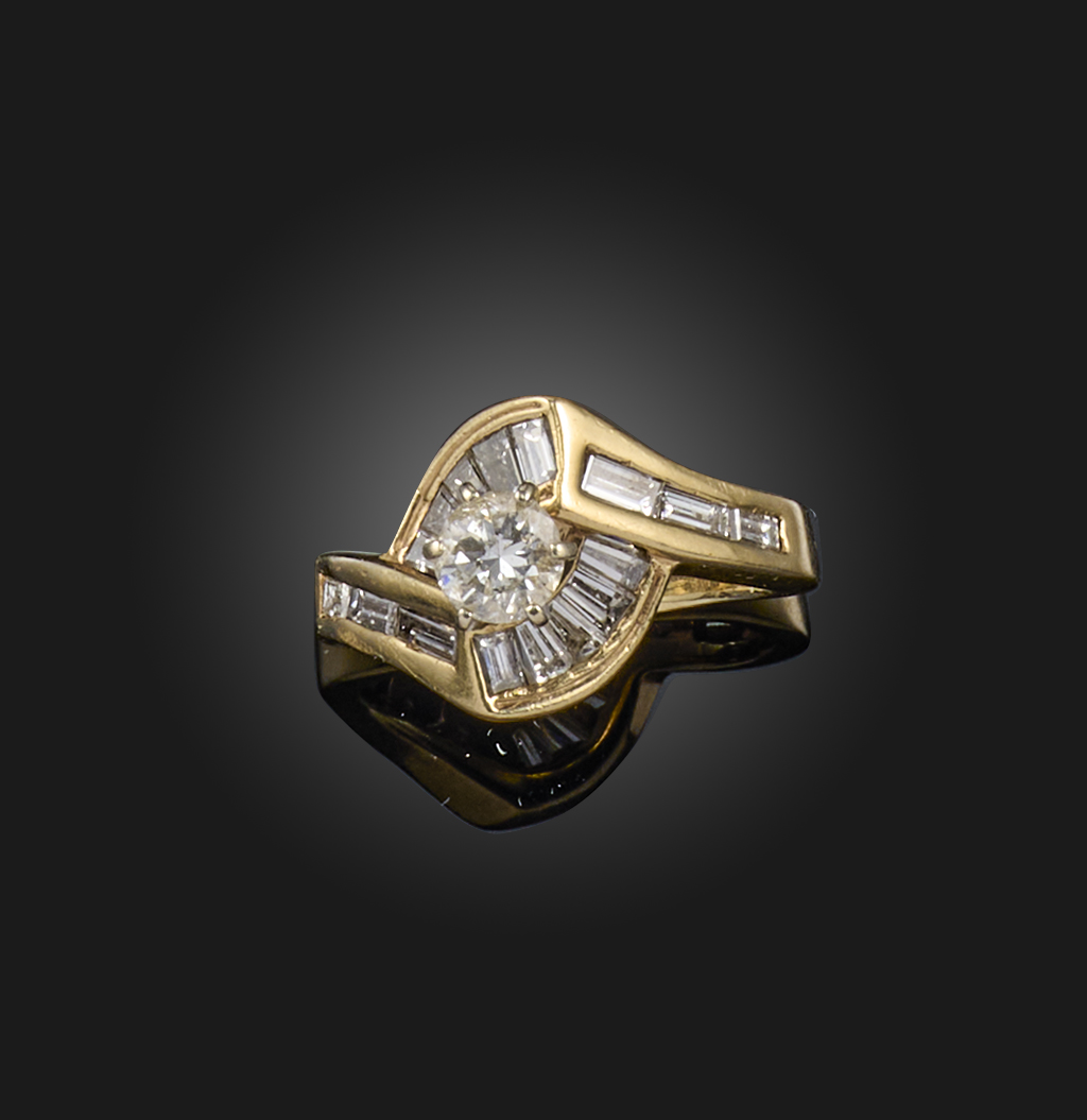 A diamond ring, claw-set with a brilliant-cut weighing approximately 0.60 carats, to an asymmetrical gold mount set with baguette and tapered baguette diamonds, size N, stamped 14K