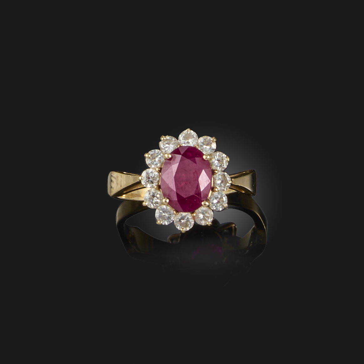 A ruby and diamond ring, of cluster design, set with an oval ruby weighing approximately 1.50