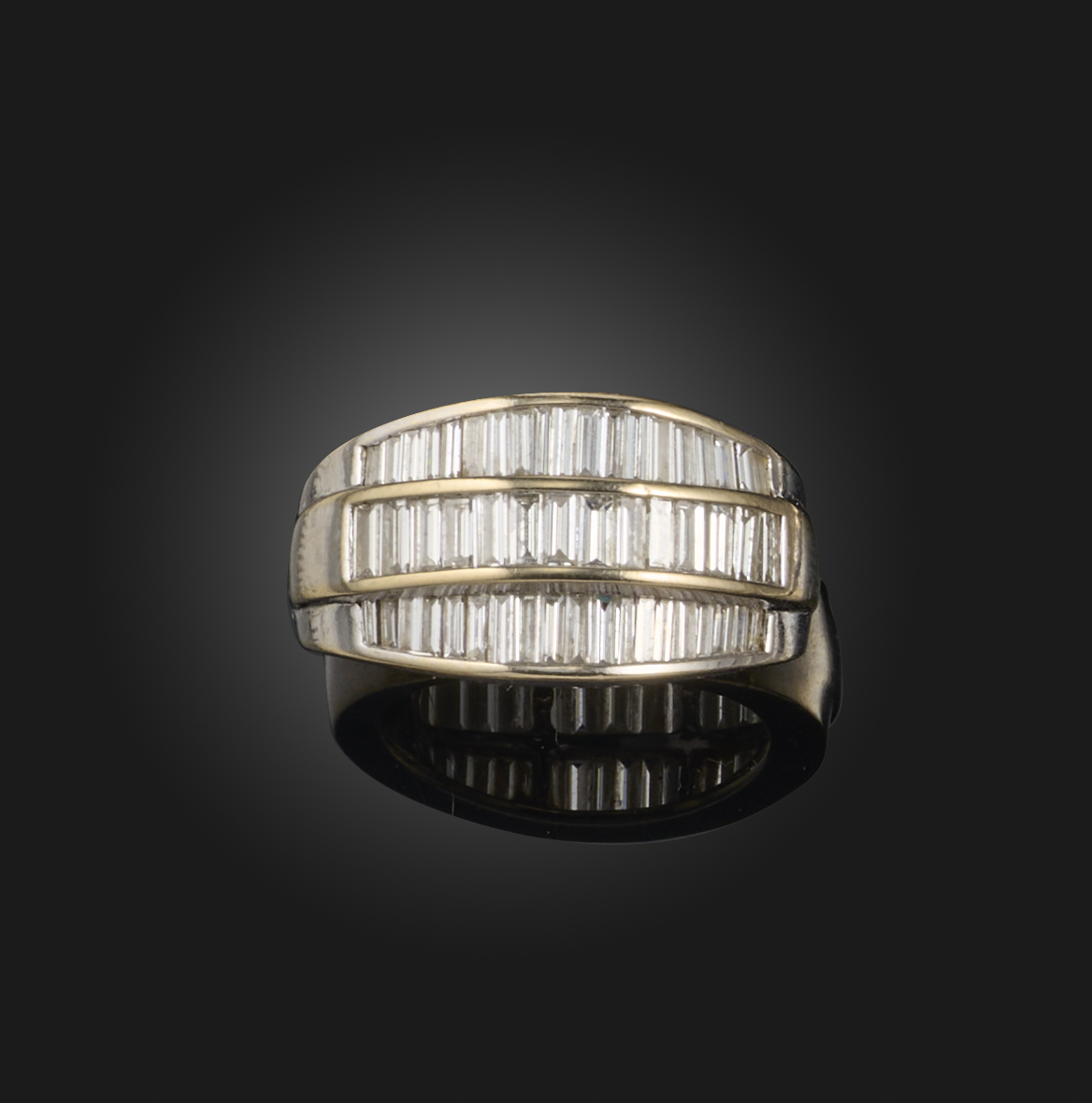 A diamond ring, channel-set to the front with three lines of baguette diamonds, mounted in white