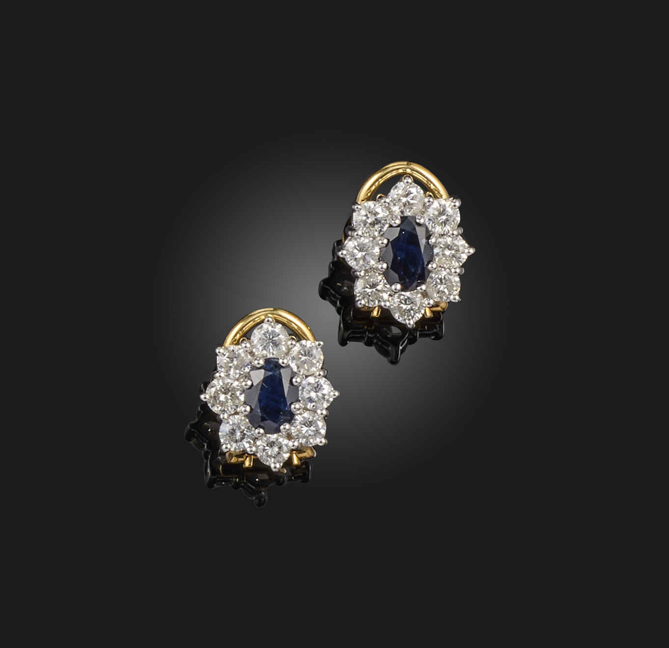 A pair of sapphire and diamond earrings, each of cluster design, set with an oval sapphire within a border of brilliant-cut diamonds, length 1.3cm each, clip fittings, British hallmarks for 18ct gold