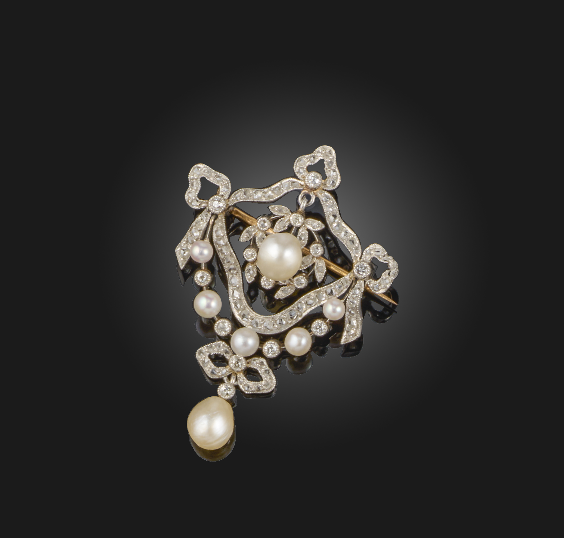 A Belle Epoque pearl and diamond pendant, set with graduated pearls within diamond-set swags in