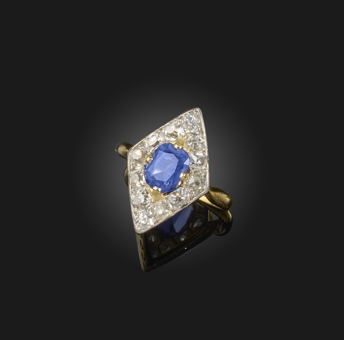 Sapphire measuring approximately 6.6 x 5.3 x 3.6mm, calculated weight approximately 0.90-1.00 carat, likely a later replacement in ring, pretty, slightly violet blue, good clarity, good condition. Estimated total diamond weight approximately 0.60 carats. Gross weight 4 grams.