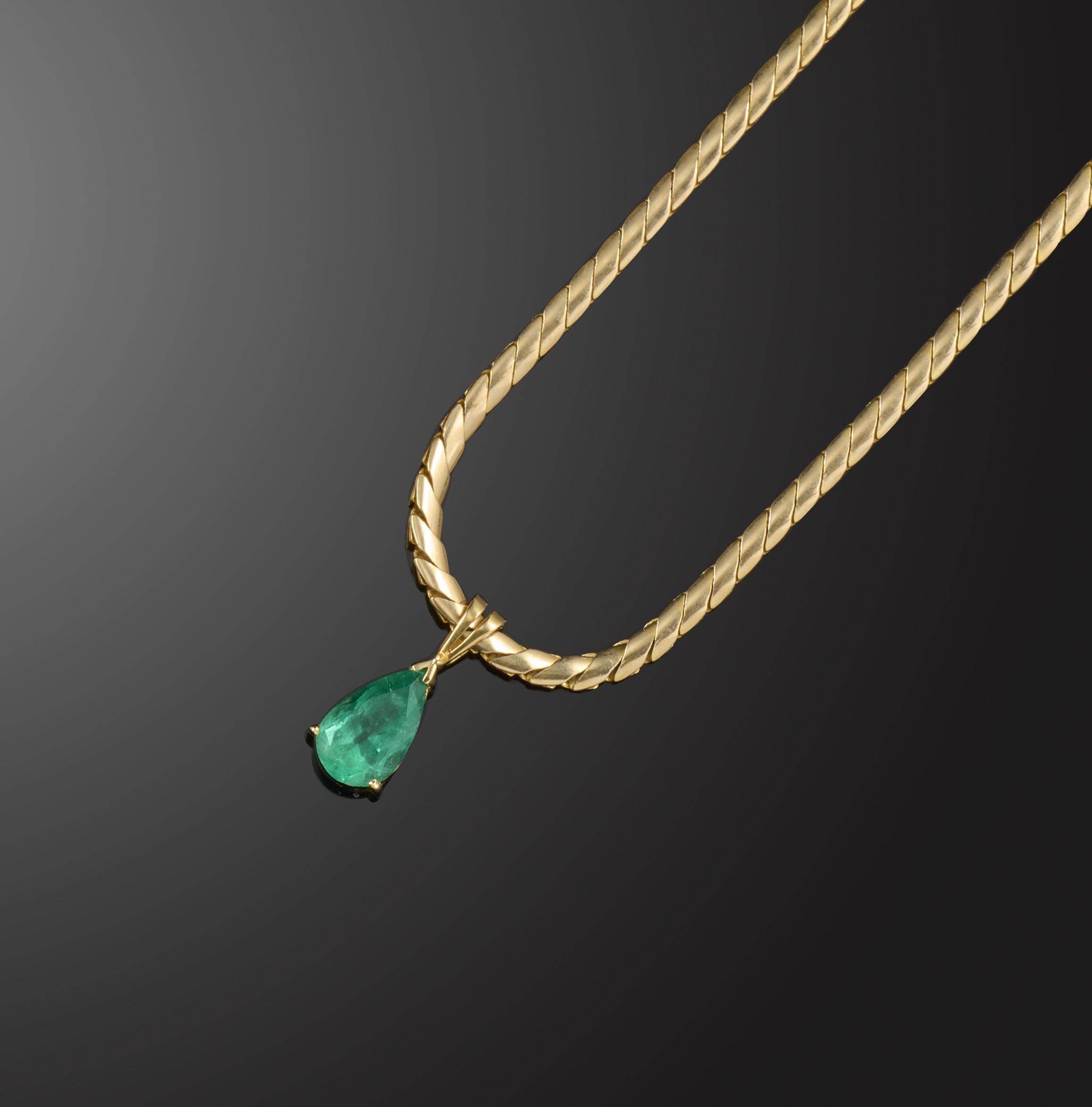 An emerald necklace, the pendant set with a pear-shaped emerald weighing approximately 2.50 carats,