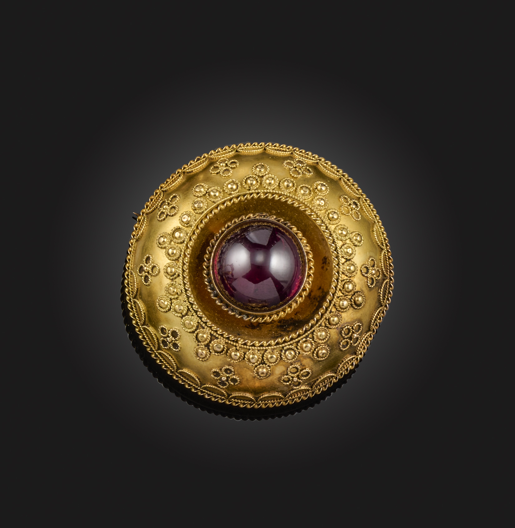 A gold and garnet brooch, mid 19th century, centring on a cabochon almandine garnet in a foil-backed setting, within a circular gold brooch designed in the Archaeological Revival style, applied with gold rope twist and grainti decoration, the reverse with a glazed locket compartment, diameter 3.7cm