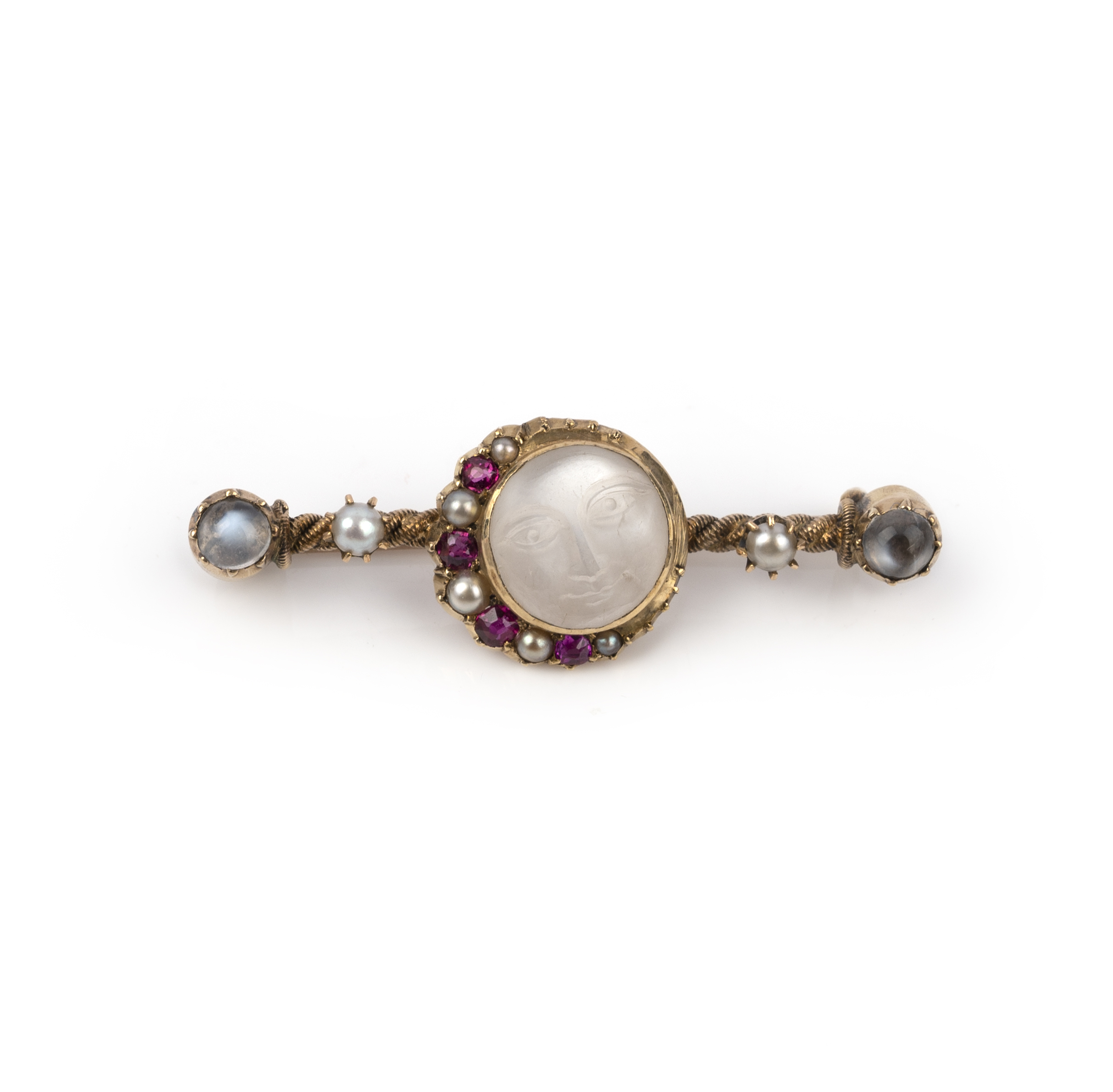 A late 19th century man in the moon brooch, set with a carved moonstone within a ruby and seed pearl