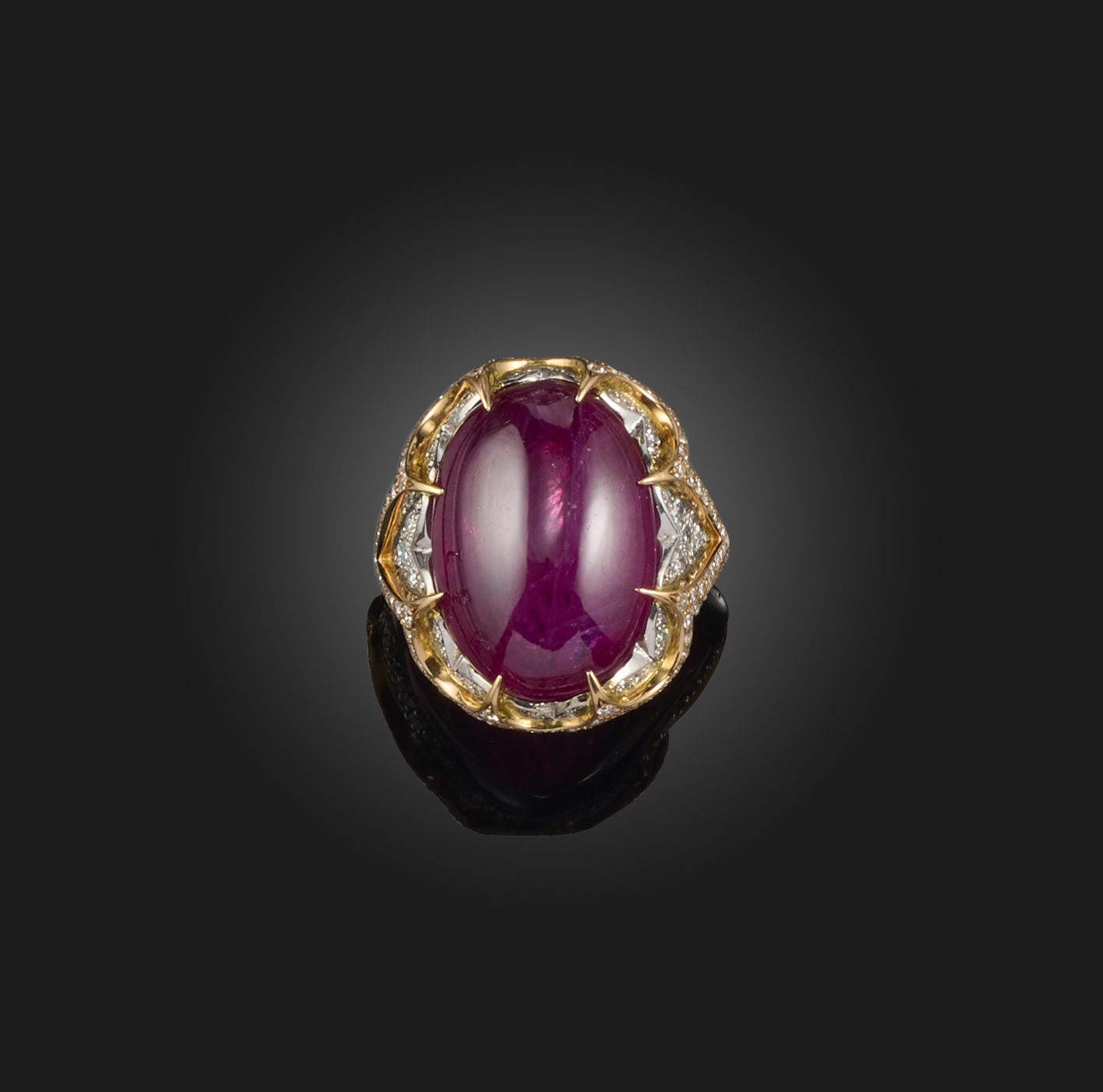 A ruby and diamond ring, claw-set with a cabochon ruby weighing approximately 16.00 carats, to a