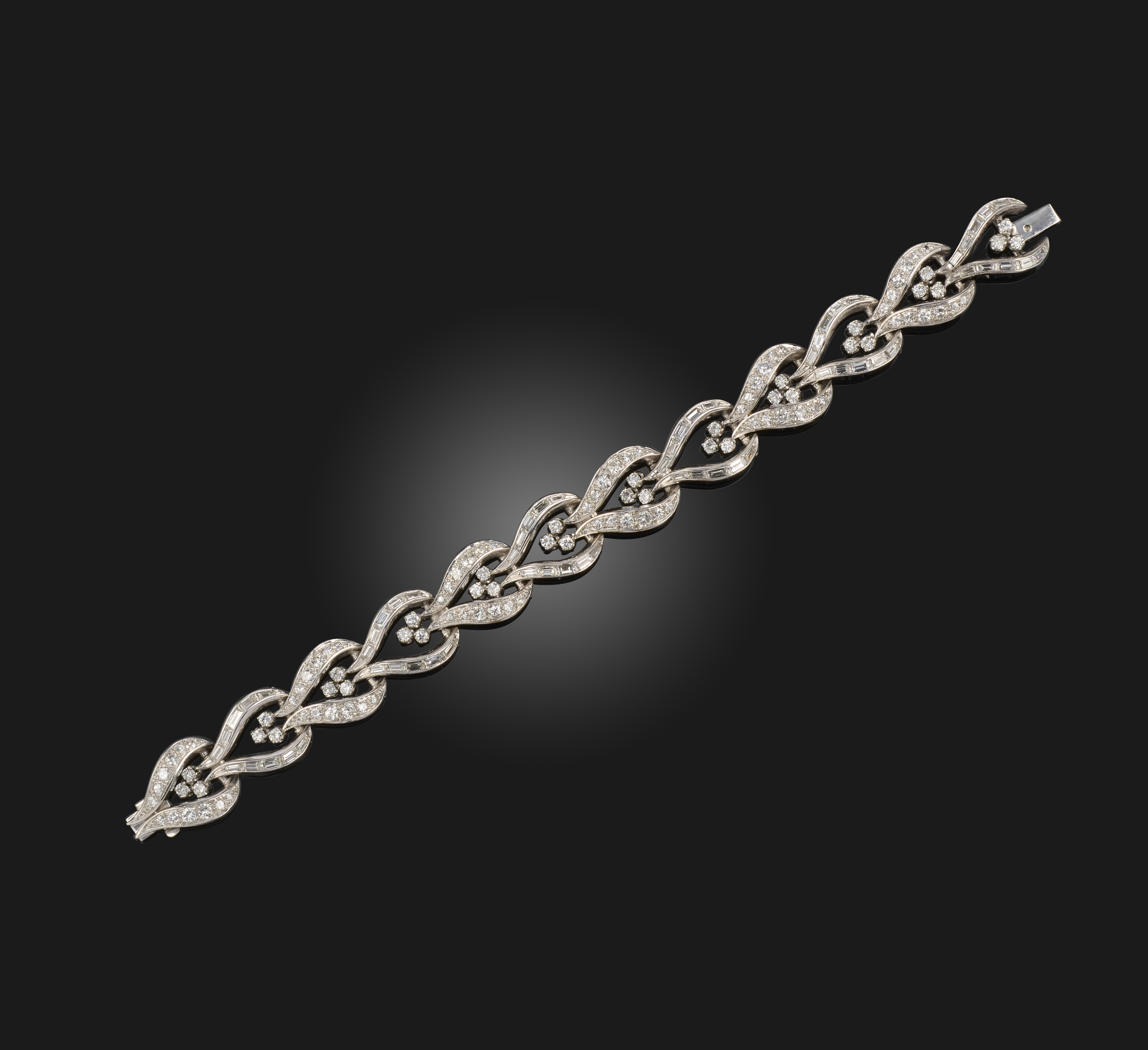 A diamond bracelet, composed of foliate links set with brilliant-cut and baguette diamonds in