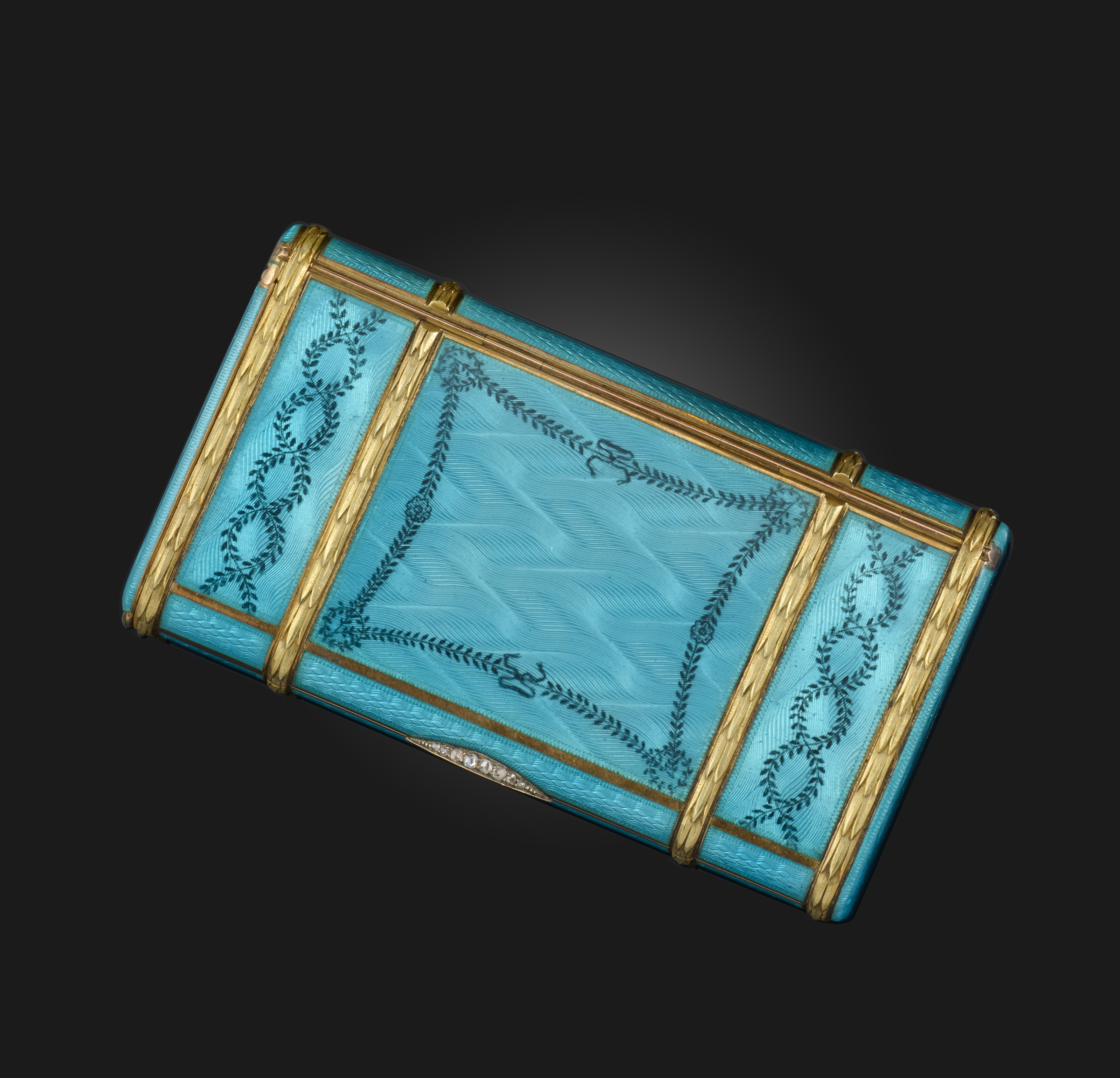 An early 20th century blue enamel cigarette case, the silver-gilt box decorated with gilded swags and a diamond thumbpiece, hinged vesta compartment to one end, length 9.8cm
