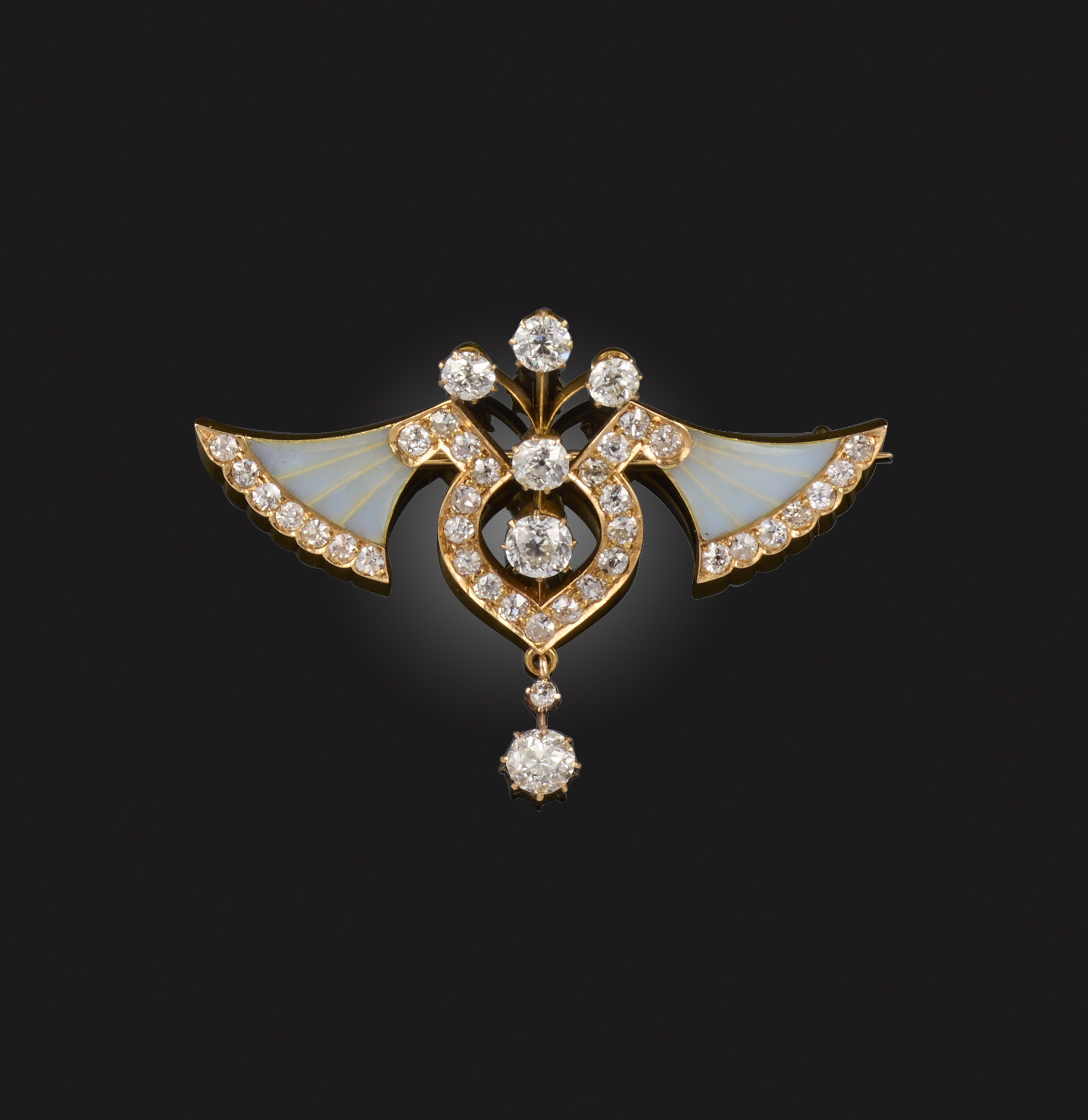 An Art Nouveau diamond and enamel brooch, circa 1900, of abstract foliate design, with flared motifs in matte plique à jour enamel to each side, set with circular-cut diamonds, mounted in gold, width 5cm