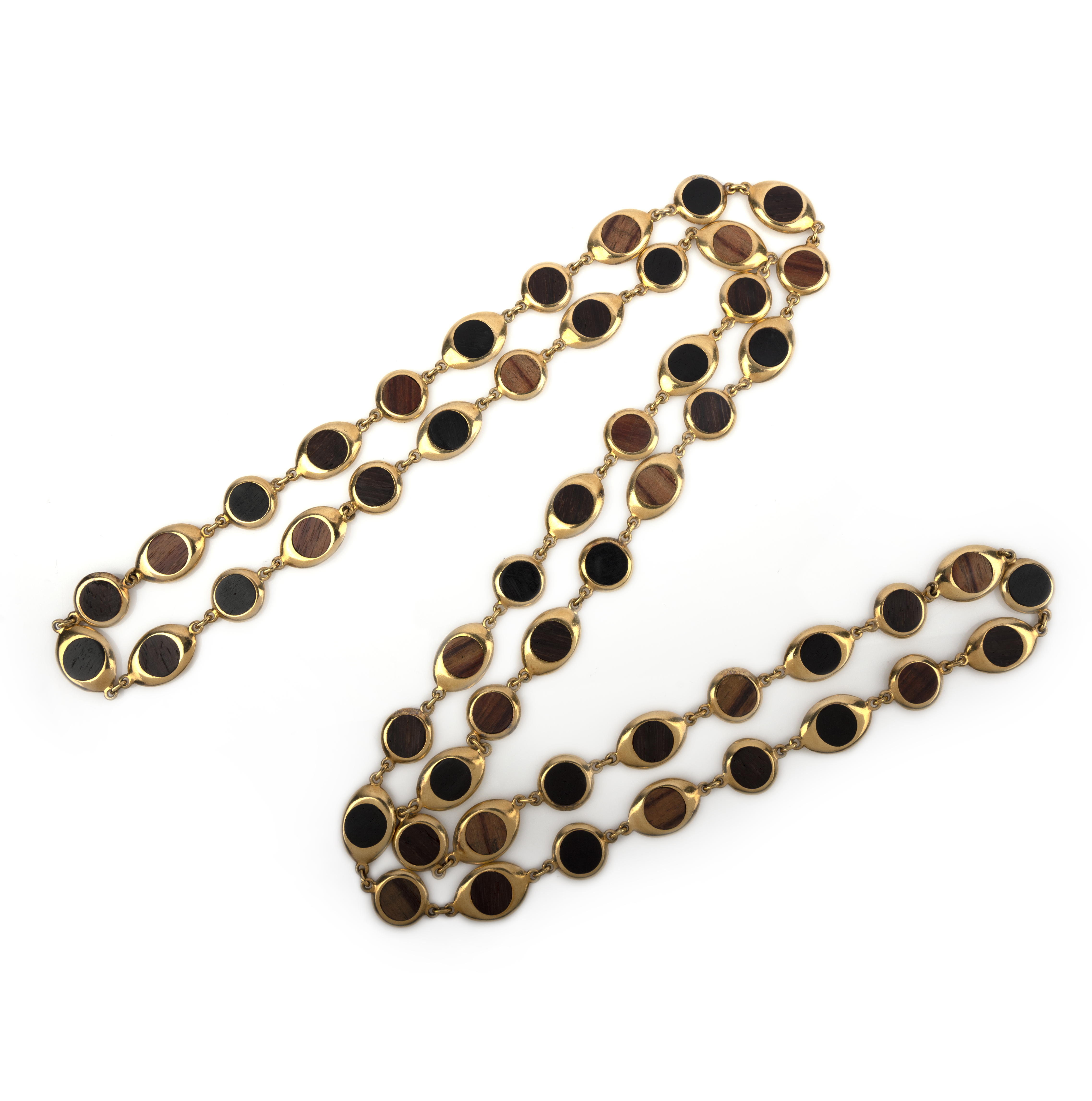 A gold and wood longchain necklace, composed of circular and navette-shaped gold links inlaid with