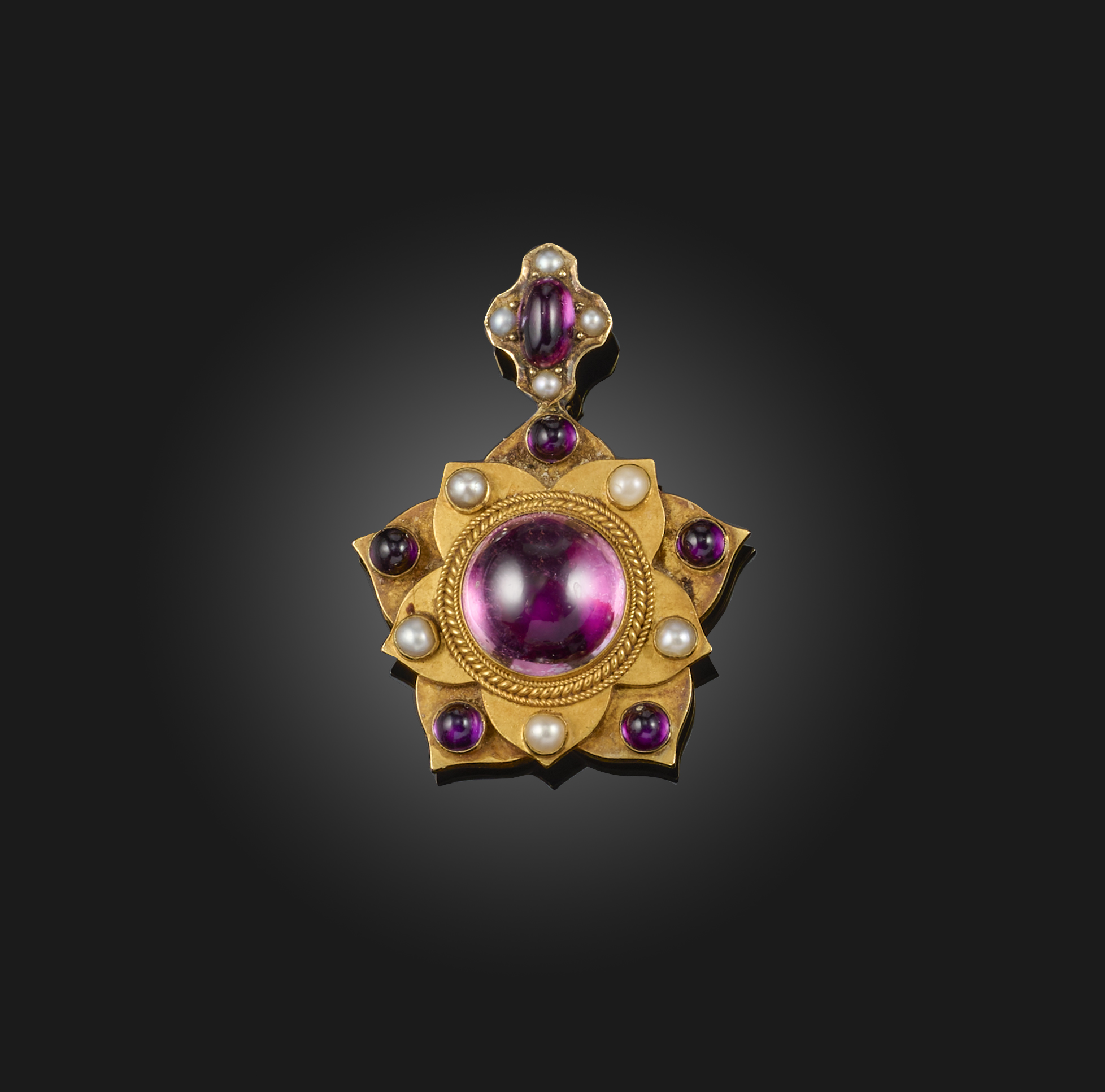 A Victorian amethyst and pearl pendant, mid 19th century, designed as a stylised flower to a quatrefoil bail, set with cabochon amethysts and half-pearls, mounted in gold, applied with rope twist decoration, the reverse with a glazed compartment, length 4.2cm, pearls untested, fitted case stamped London & Ryder
