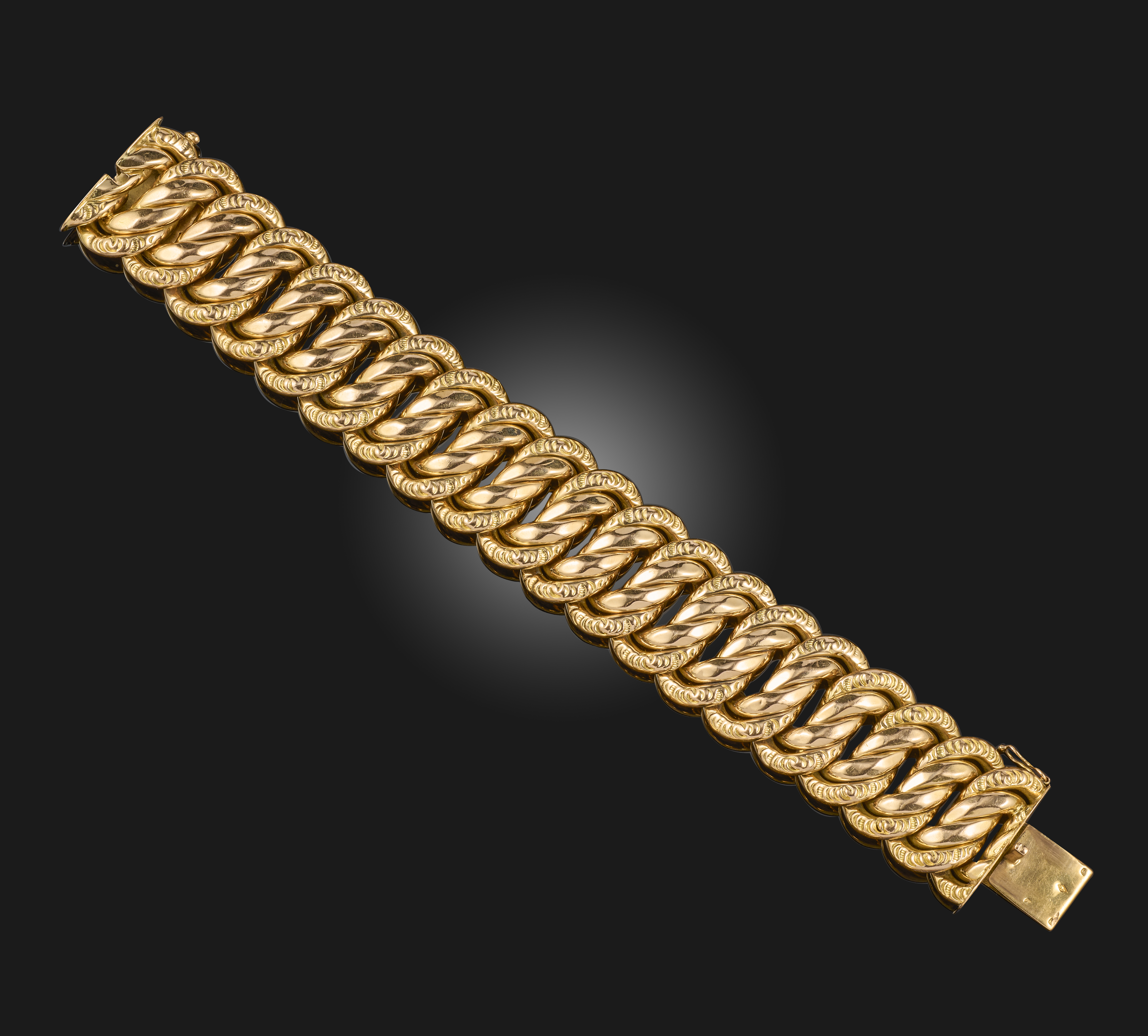 A wide curb-link gold bracelet, of plain and textured linking, French control marks and maker's