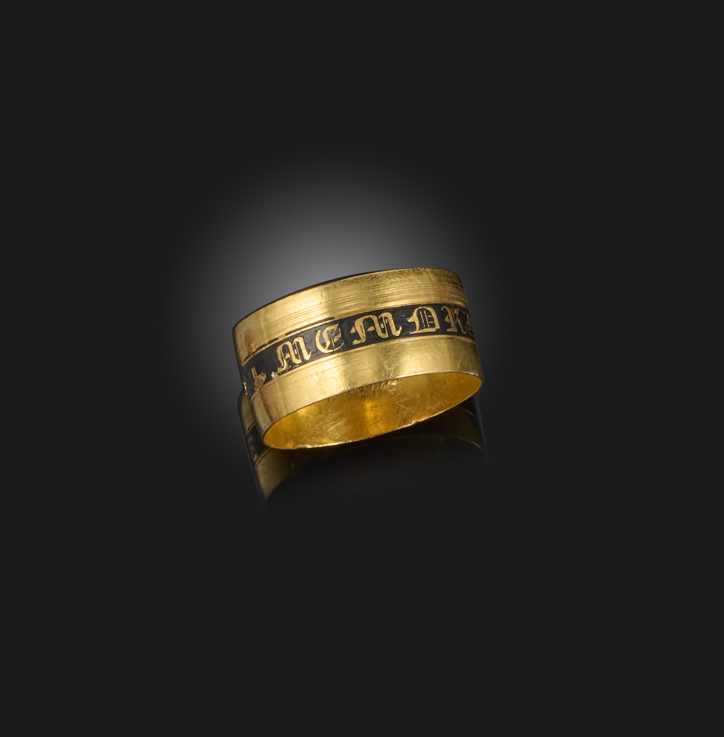 An early 19th century gold mourning ring, C1819, decorated with black enamel spelling In Memory Of,