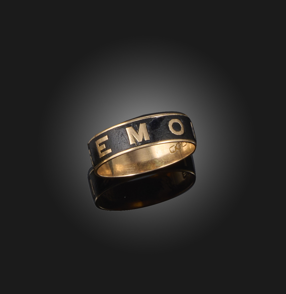 An early 20th century enamel mourning ring, decorated with black enamel and the words In Memory Of,