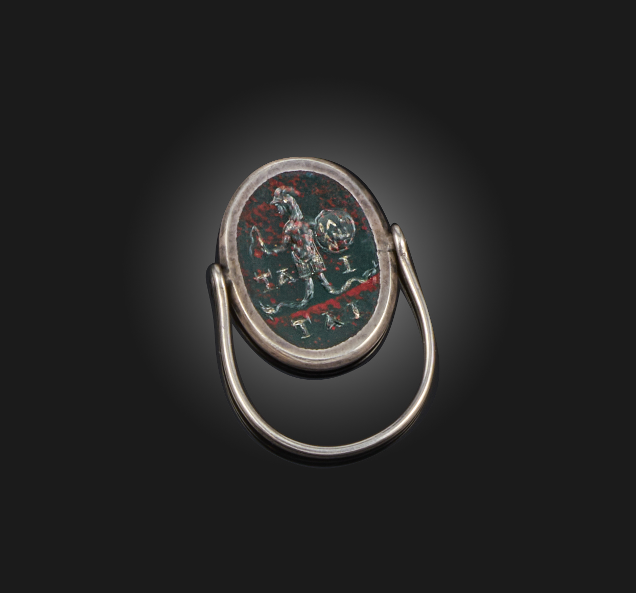 A fine and rare bloodstone magical gem, Greco-Roman, 2nd-3rd century AD, the two-sided bloodstone intaglio of oval outline, carved on one side to depict a crowned sun god bordered with Greek script, the other side depicting the cockerel-headed god Abrasax/Abraxas, with snake legs, holding a shield and whip his shield with an inscription, the background inscribed TAI TAI, to a later swivel mount on a half hoop ring, intaglio 1.7 x 1.4cm