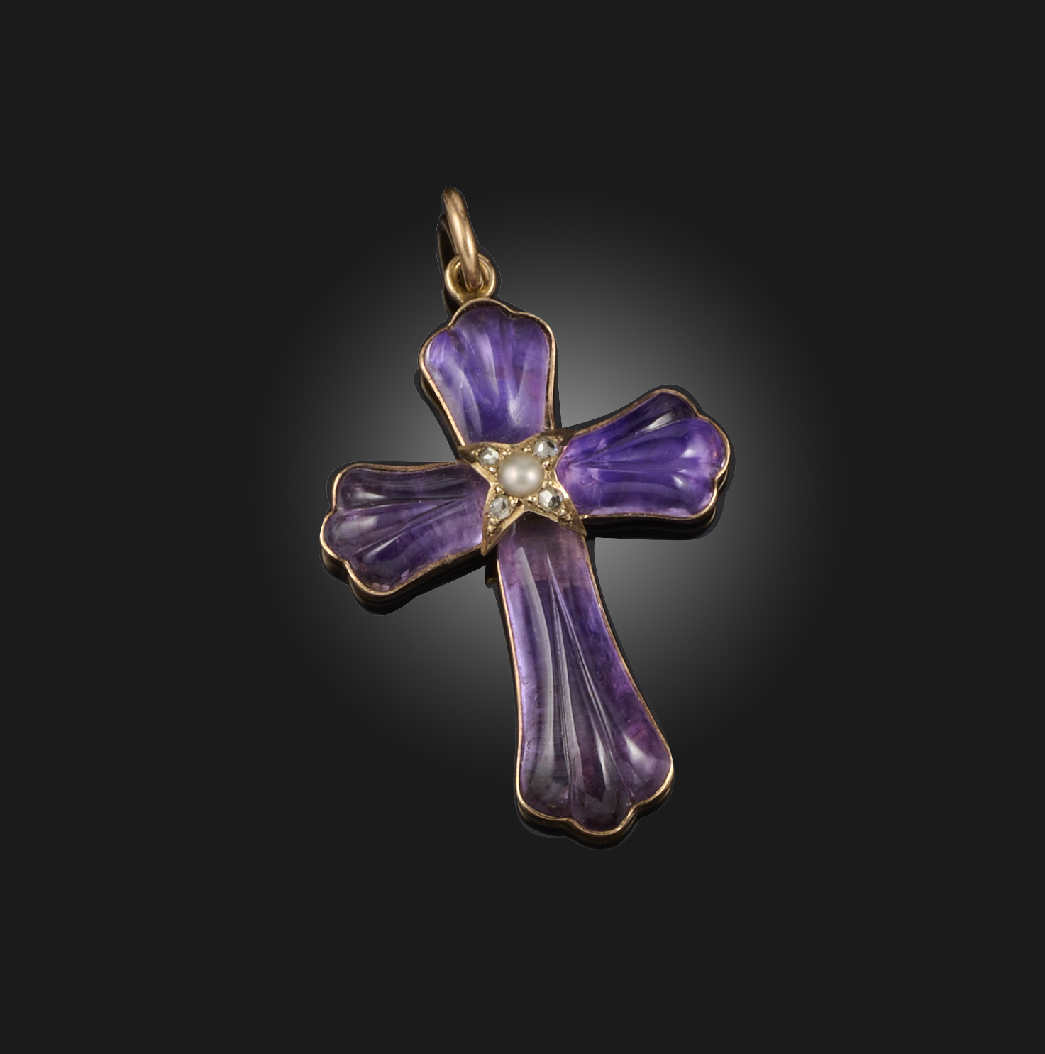 A Victorian amethyst, seed pearl and diamond pendant, late 19th century, designed as a cross, set with carved amethyst, the centre accented with a seed pearl and rose-cut diamonds, mounted in gold, length 4.4cm