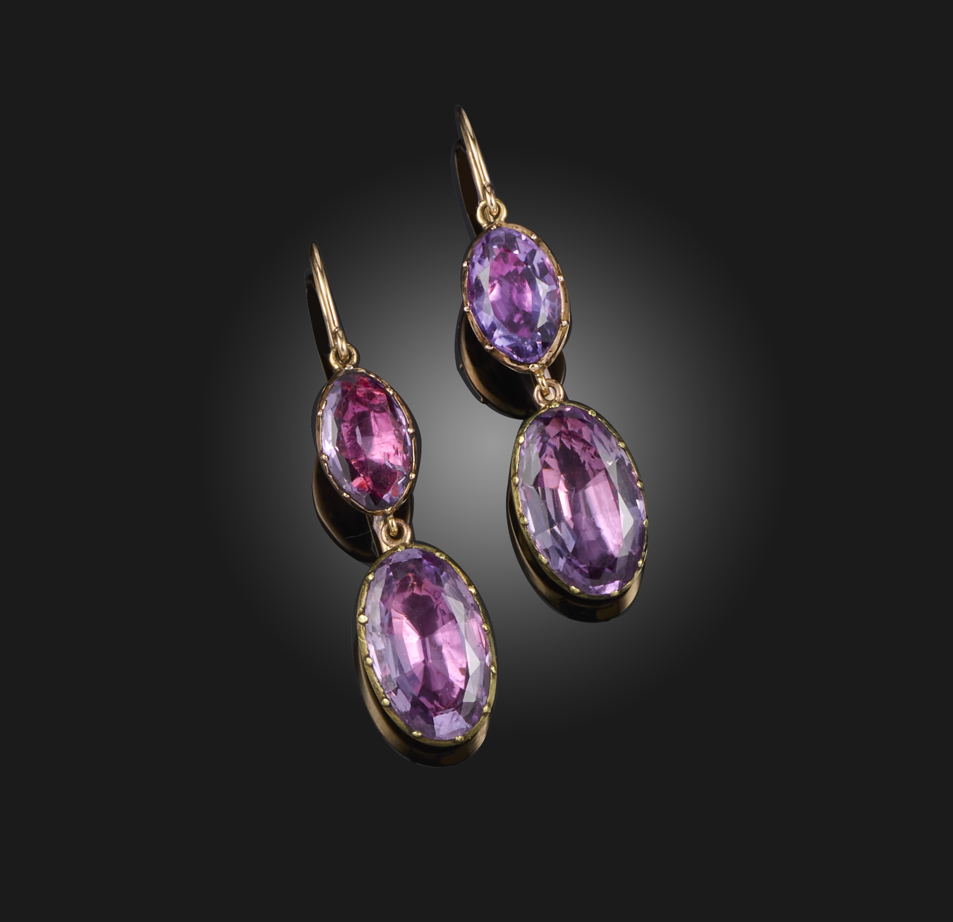 A pair of amethyst earrings, early 19th century and later, each composed of two oval step-cut