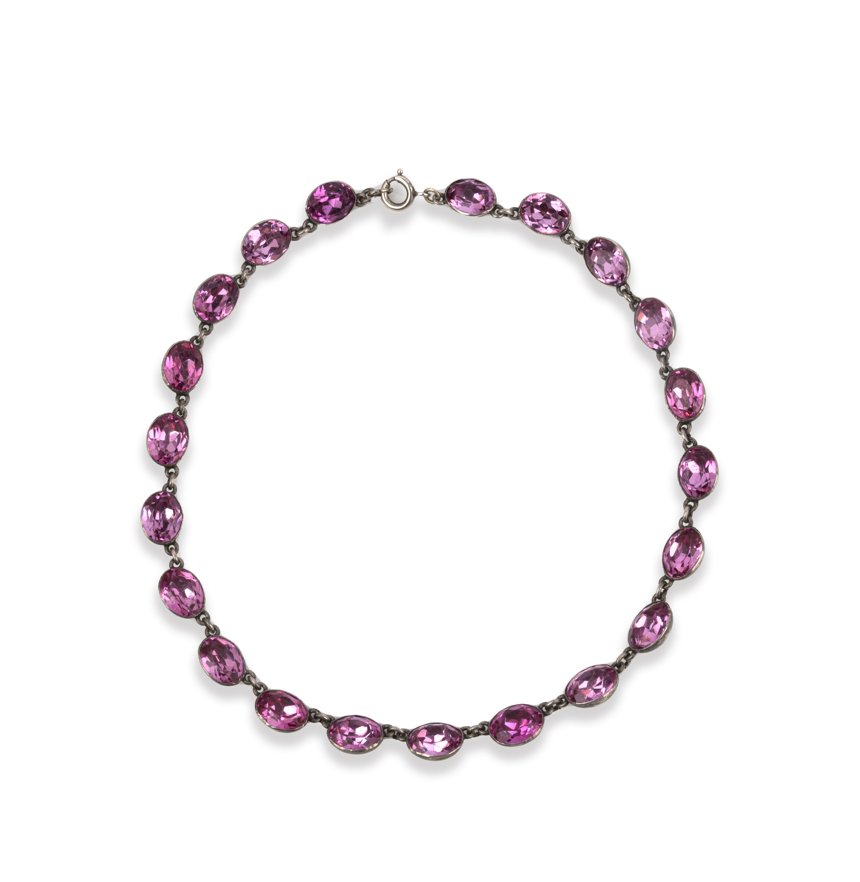 An early 19th century pink paste riviere necklace, set with oval pink pastes in silver closed-back