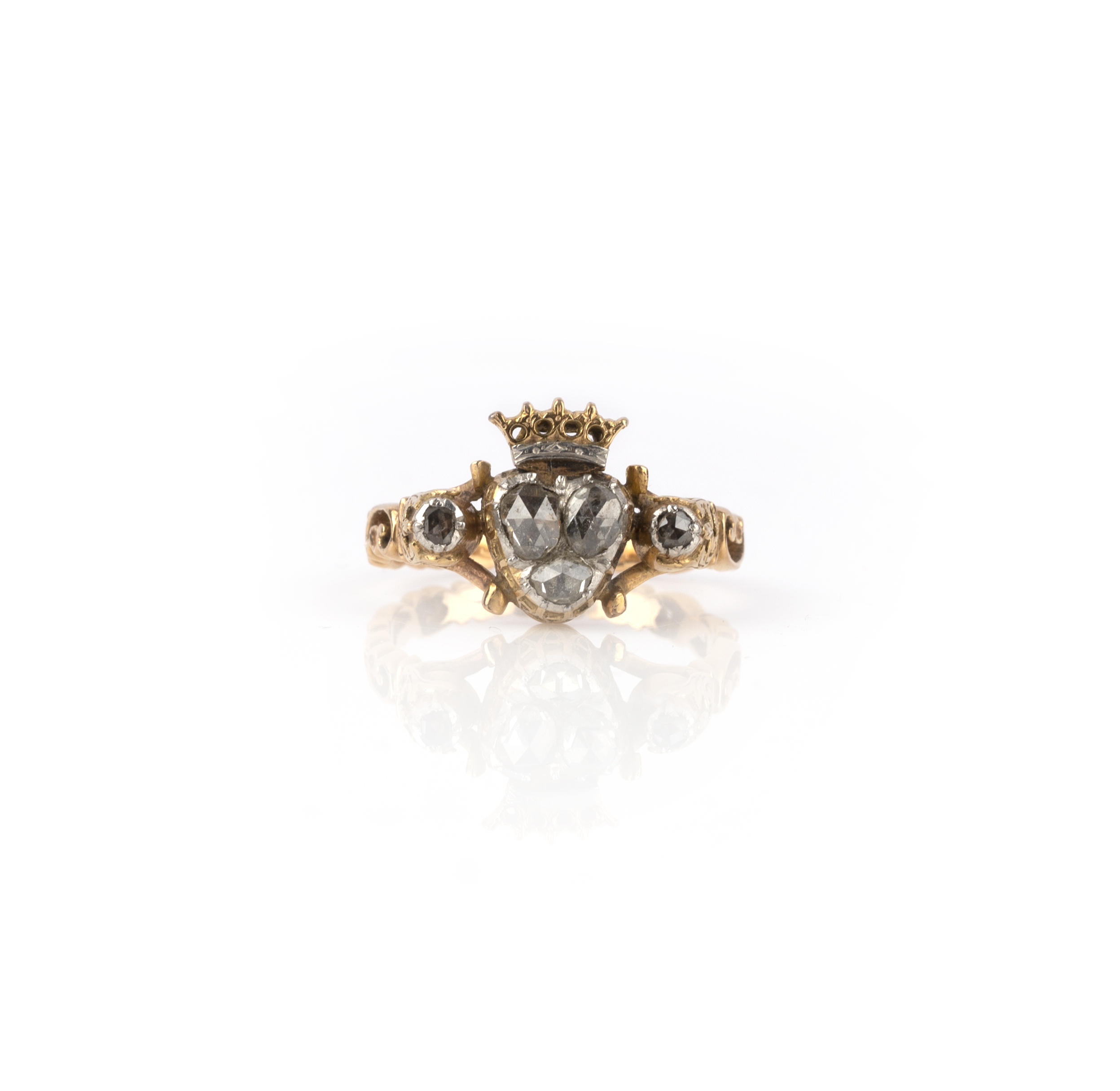 A diamond ring, of Baroque inspiration, designed as a crowned heart, set with rose-cut diamonds, to