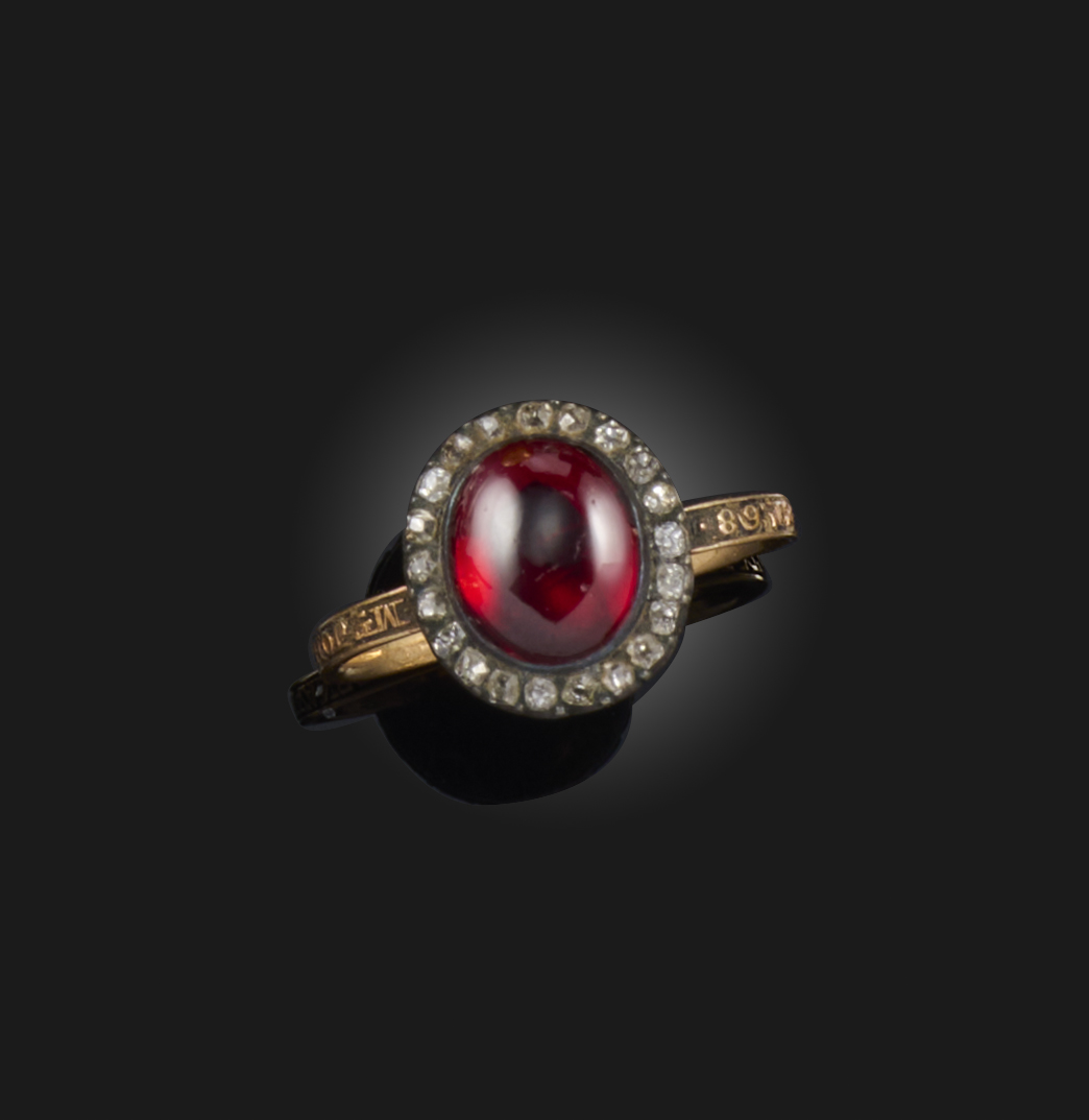 A garnet and diamond mourning ring, late 18th century, set with a cabochon garnet within a border of