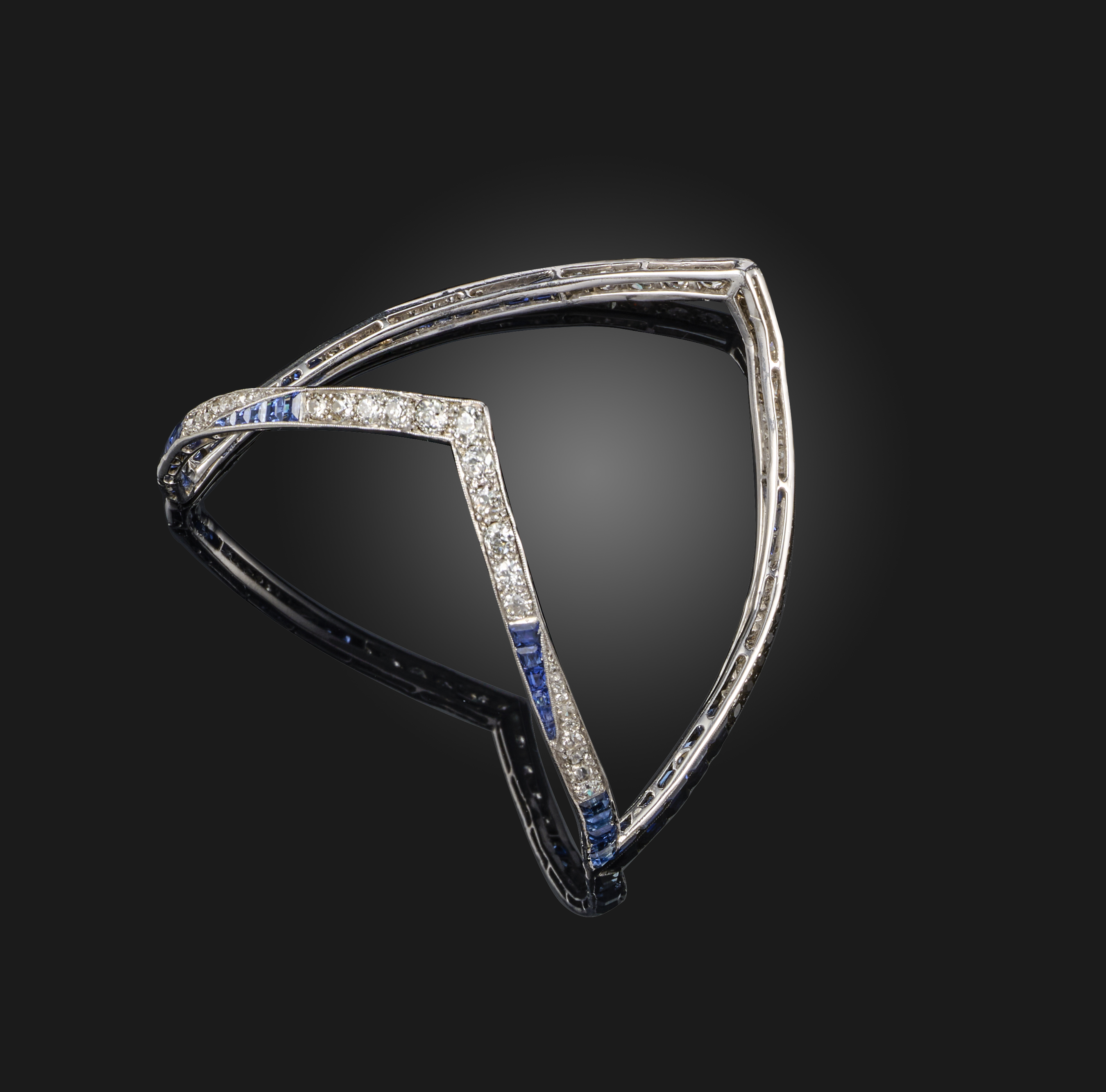 An early 20th century sapphire and diamond bangle, the stylised V-shaped bangle millegrain-set with circular-cut diamonds and calibré-cut sapphires in a geometric pattern, set in platinum, internal width 5.7cm, in case marked Linden & Co