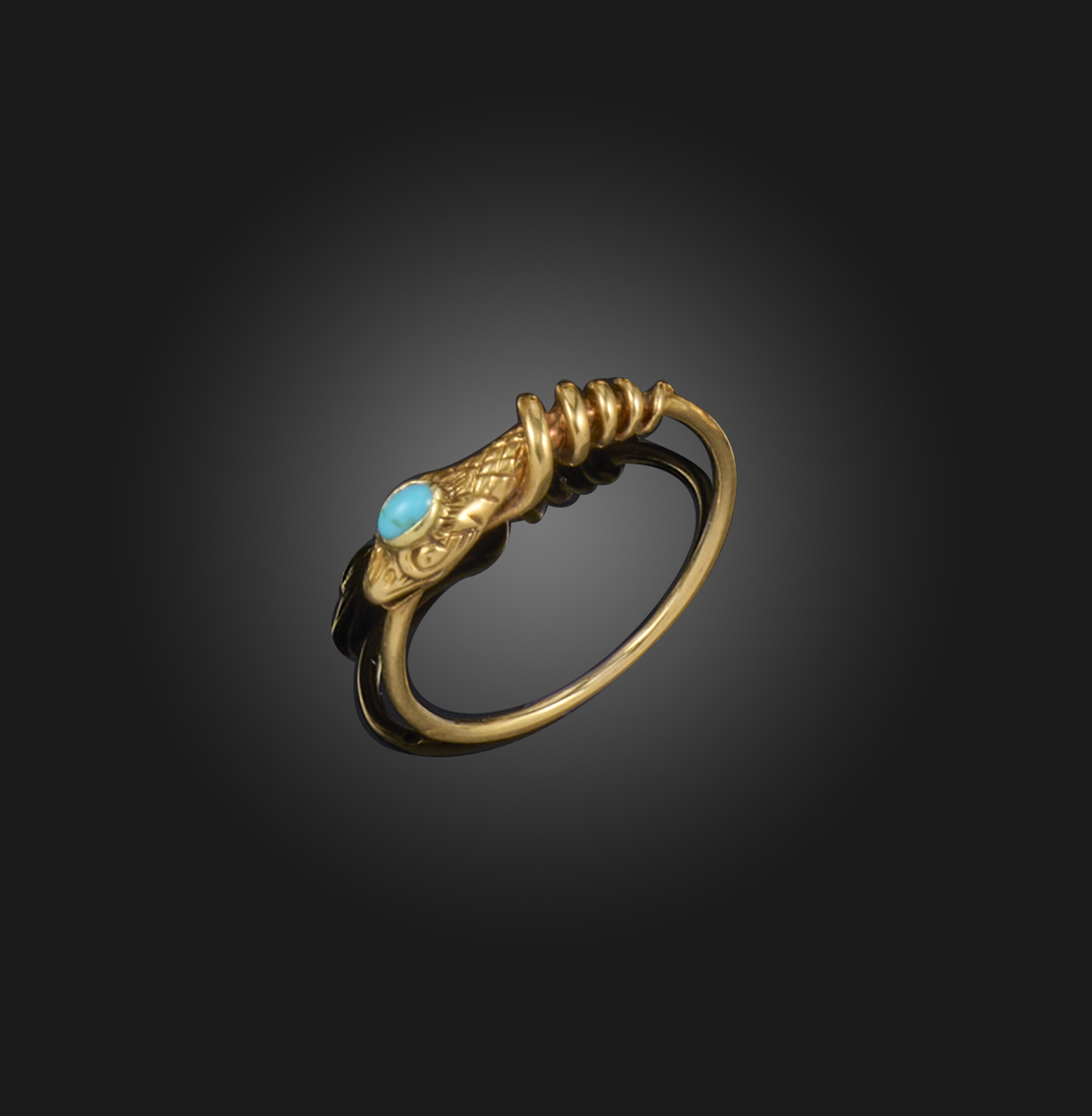 A gold and turquoise ring, France, circa 1819-35, designed as a coiled snake, its head set with a