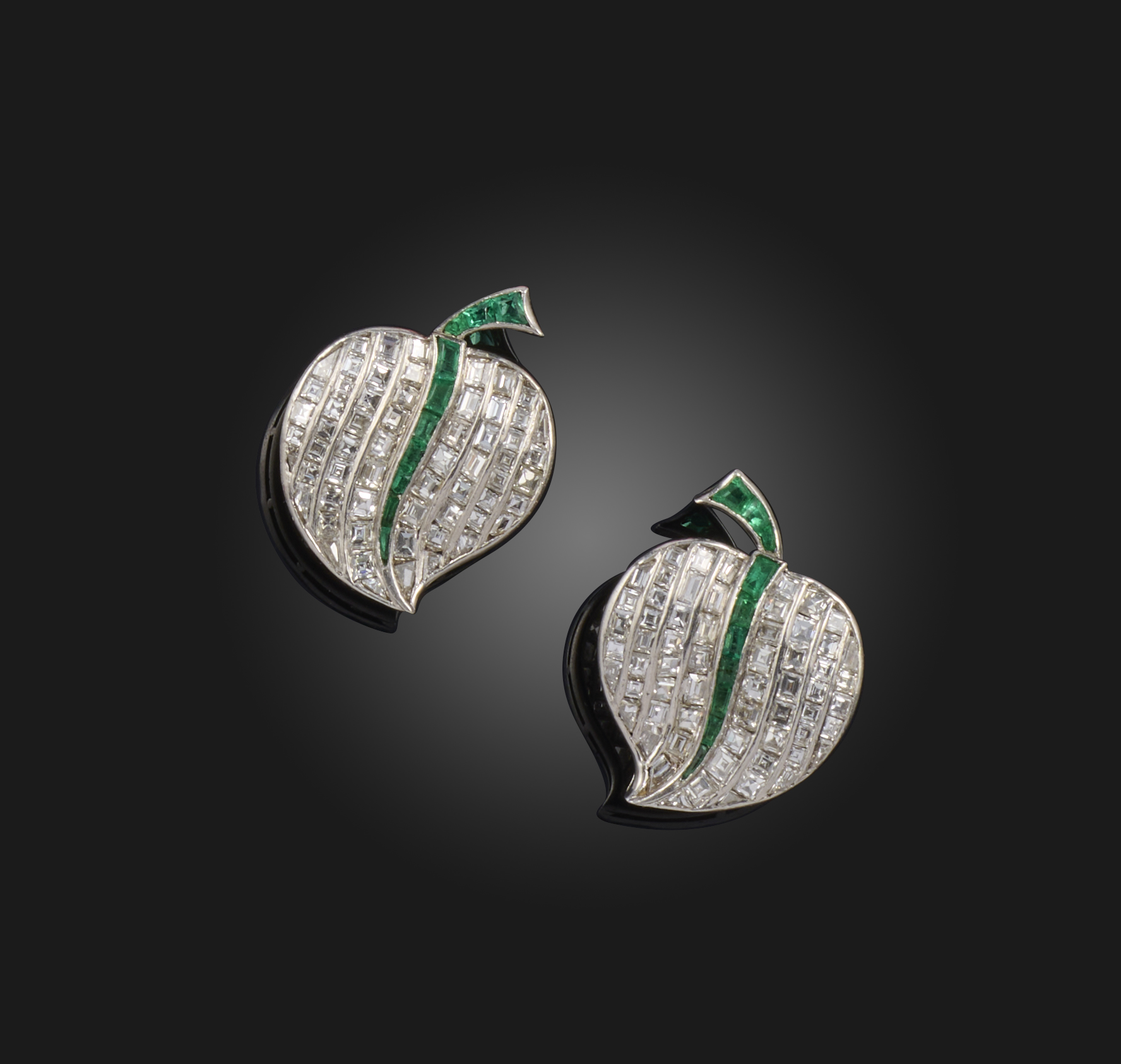 A pair of early 20th century emerald and diamond leaf earrings, set with a central line of emeralds