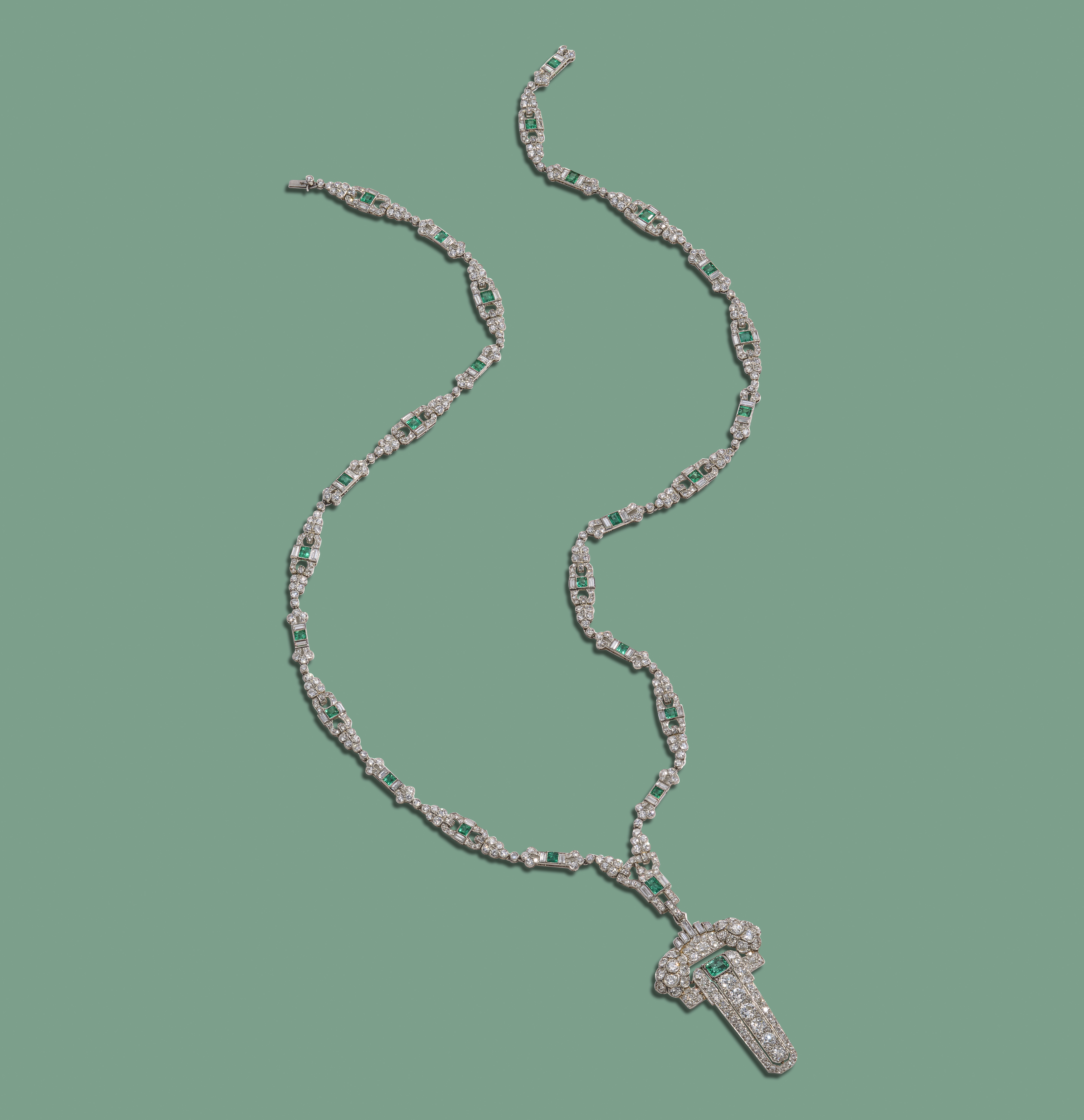 Rood, a remarkable cased Art Deco emerald and diamond sautoir, London, 1920s, the sautoir composed of geometric links set with step-cut emeralds and baguette diamonds, between abstract foliate motifs set with circular-cut diamonds, detaching to form two bracelets and a shorter necklace, suspending an elongated pendant of geometric design, set with circular-cut and baguette diamonds and a step-cut emerald, the shoulders set with three-dimensional floral motifs set with circular-cut diamonds, mounted in platinum, sautoir length 76.5cm, pendant length 6.3cm including bail, bracelets 18cm each, necklace with bracelets detached 39.8cm, pendant signed Rood, clasps stamped Pt, original fitted case stamped Rood, 52 & 53 Burlington Arcade, London W1