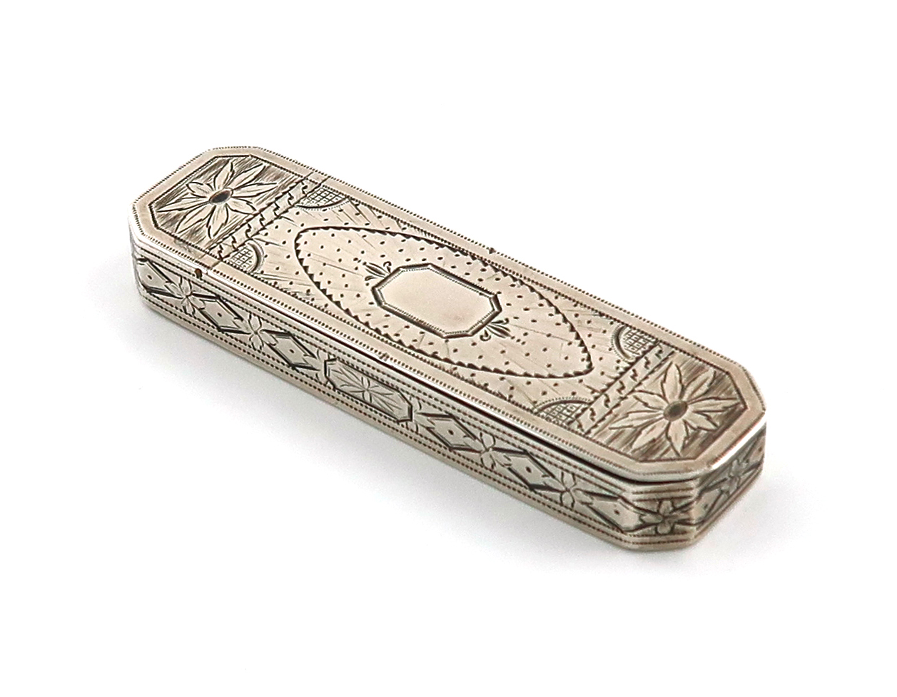 rectangular form, canted corners, engraved decoration, the interior of the base velvet lined, length 8cm, approx. weight 1oz.
