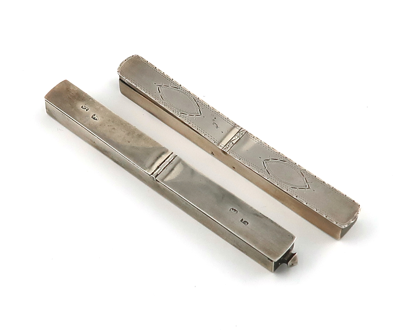 slender rectangular form, two hinged compartments, engraved decoration, length 9.3cm, plus another George III silver tooth powder box, London 1791, approx. total weight 1.1oz. (2)