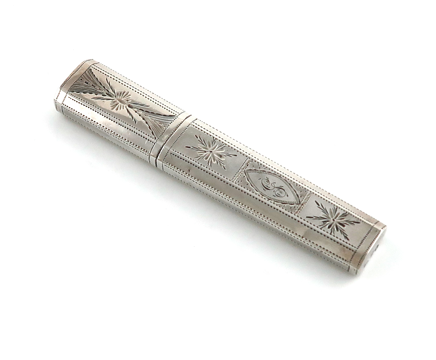 tapering rectangular form, canted corners, engraved decoration, initialled, length 9cm, approx. weight 0.4oz.