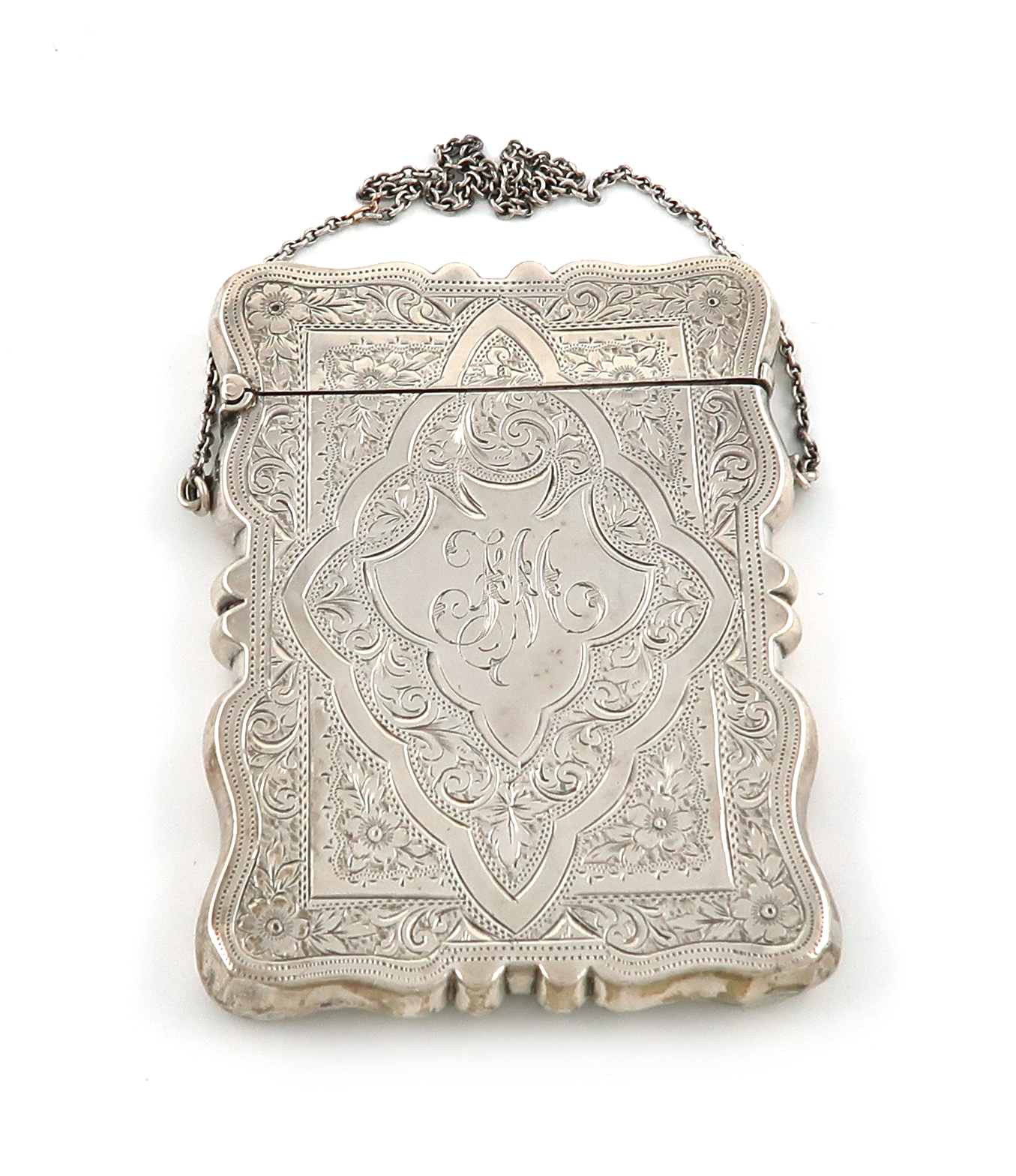 rectangular form, chased foliate decoration, initialled, with a chain, length 10.4cm, approx. weight 3.6oz.