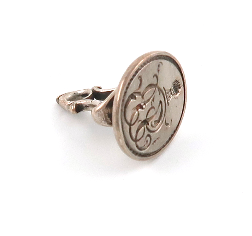 oval form, pierced handle, engraved with initials below a crest, approx. weight 0.2oz.
