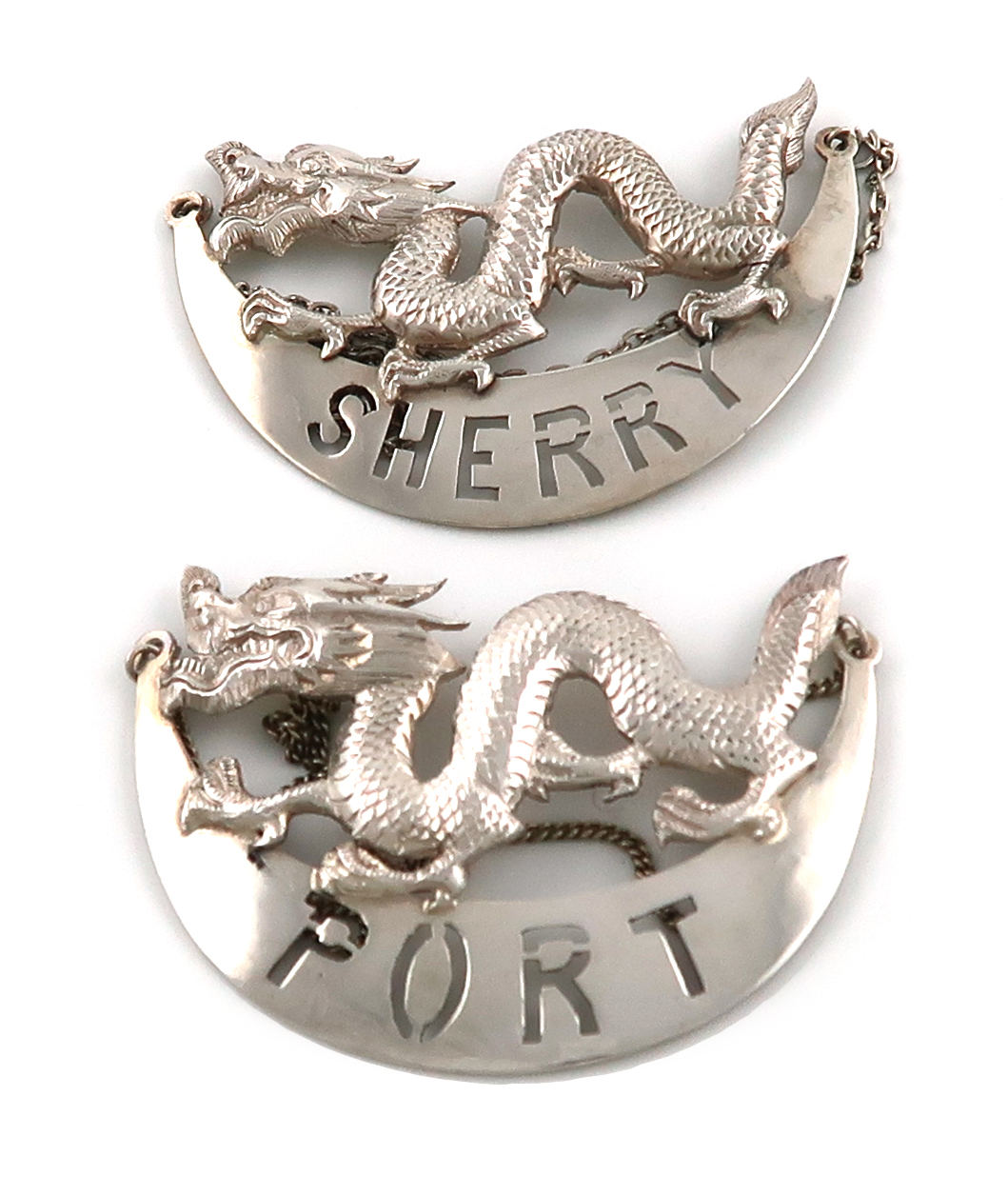 crescent form, mounted with a dragon, pierced 'Port' and 'Sherry', approx. weight 0.7oz. (2)