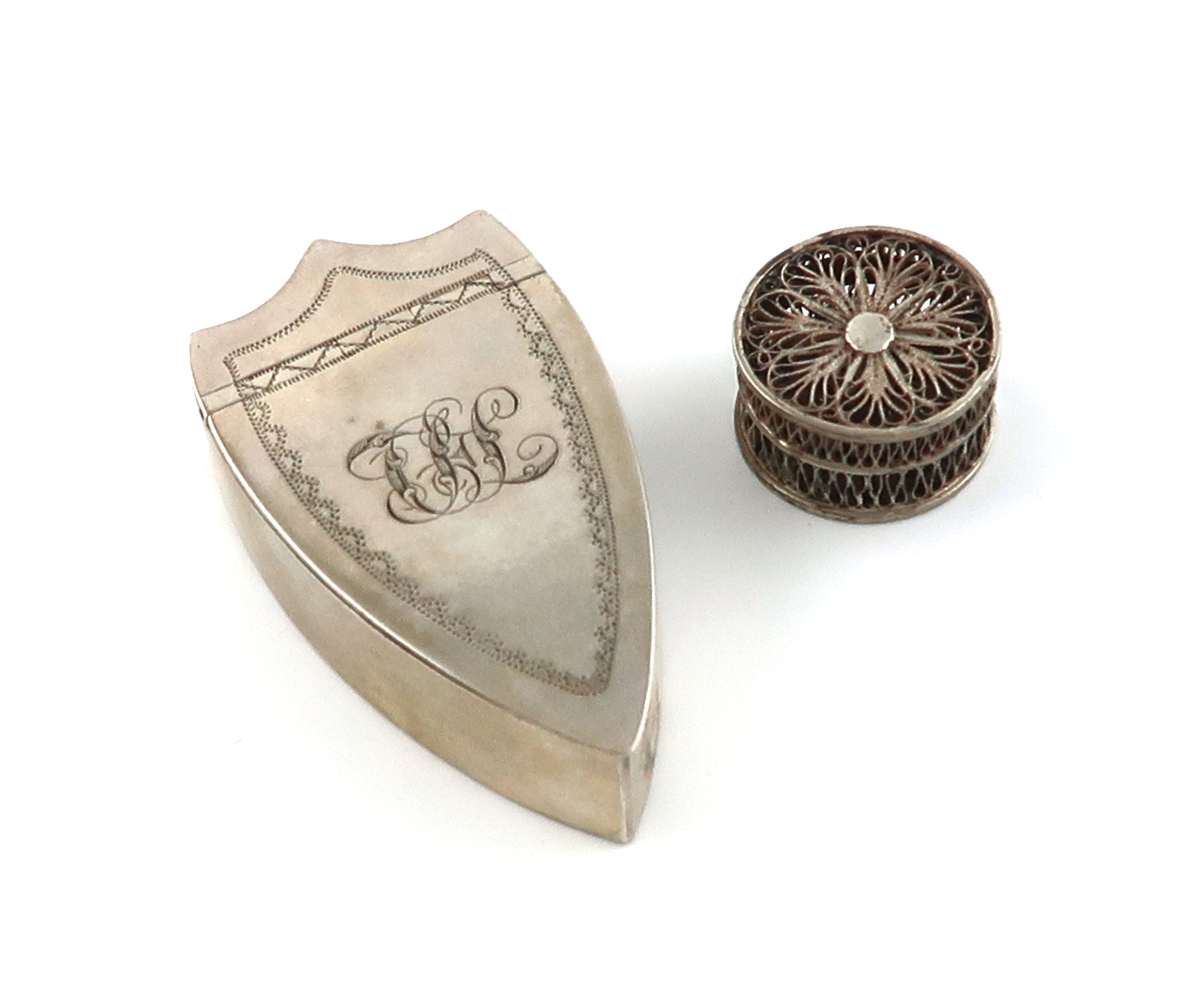 circular form, foliate decoration, plus an electroplated snuff box, of shield form, flush-hinged cover, with initials. (2)
